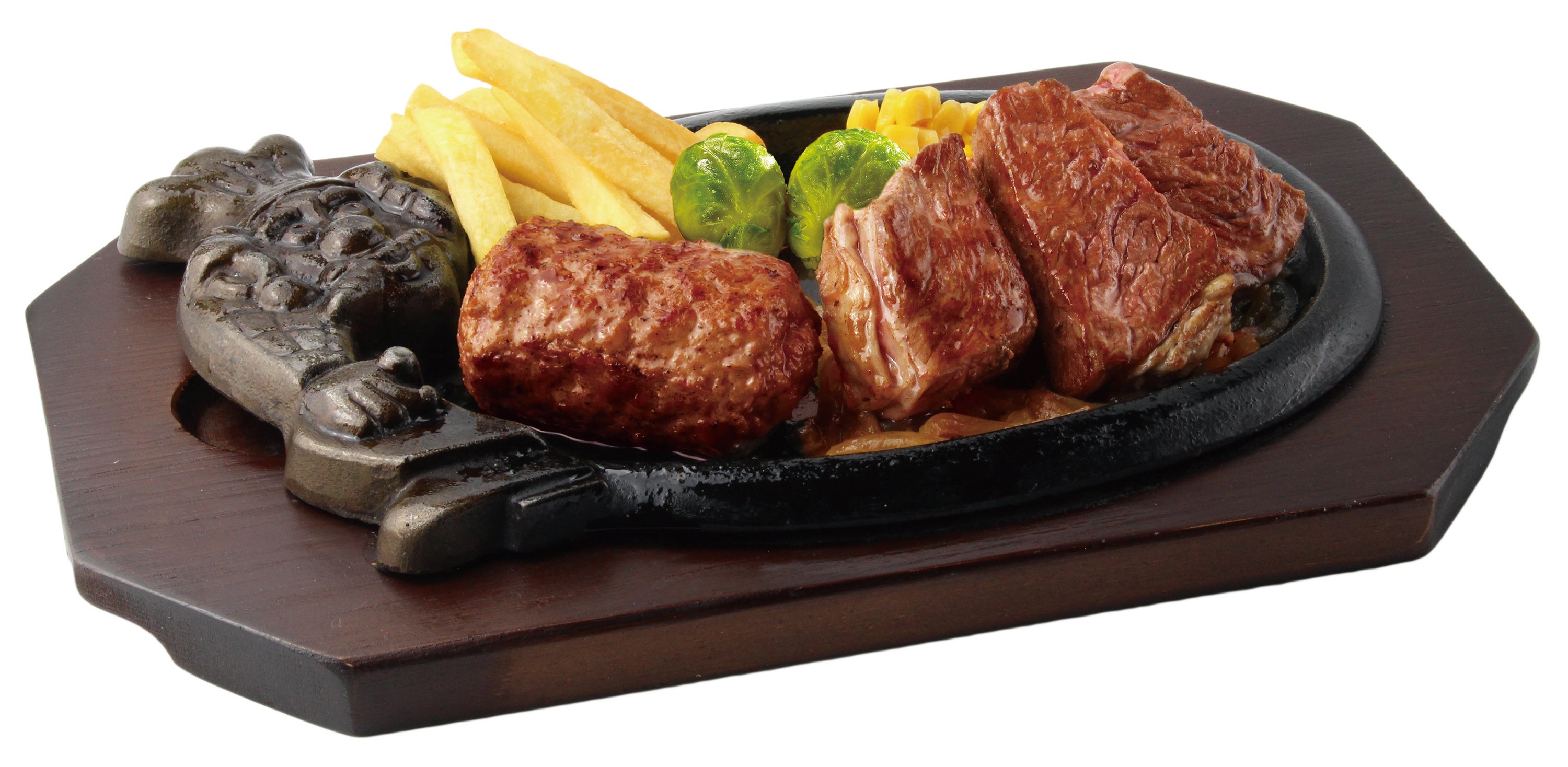 肩ロースの中でも、牛1頭から約2㎏しか取れない、やわらかく濃厚な味わいが特徴の希少性の高い部位です。希少性が高いがゆえに、不揃いな形ではございますが、その分リーズナブルにお楽しみいただけます。また 単品メニューの他に、人気No.1 ビーフ100%の「炭焼き がんこハンバーグ」とのコンビメニューもご用意いたしました。ステーキとビーフ100%のハンバーグ、どちらも少しずつ味わえる大満足な一品です。