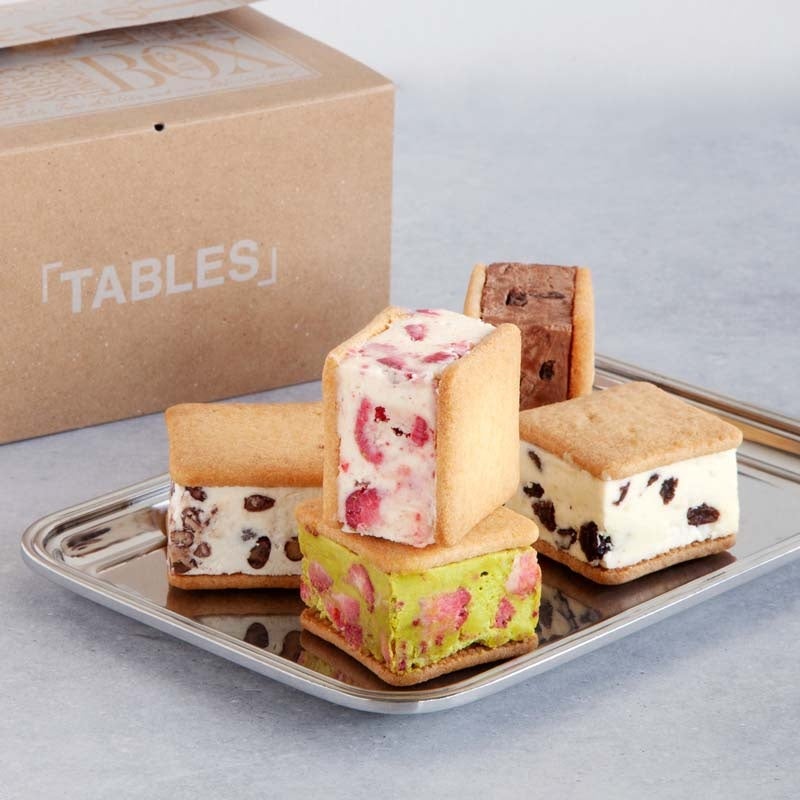 (塩あんバター1,000円・イチゴミルク1,200円(各3個入)など全5種)大阪・南堀江の緑あふれる公園前の心地よいロケーションでゆったりとランチが食べられる食堂カフェ「TABLES(タブレス)」のテイクアウトスイーツ。ホワイトチョコを混ぜ込んだコクのあるバタークリームに自家製のラムシロップに漬け込んだレーズンやフリーズドライのイチゴをあわせてサンドしています。