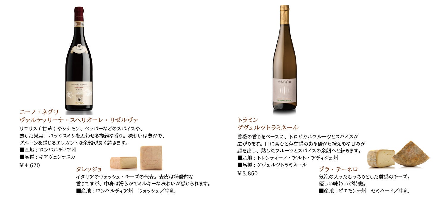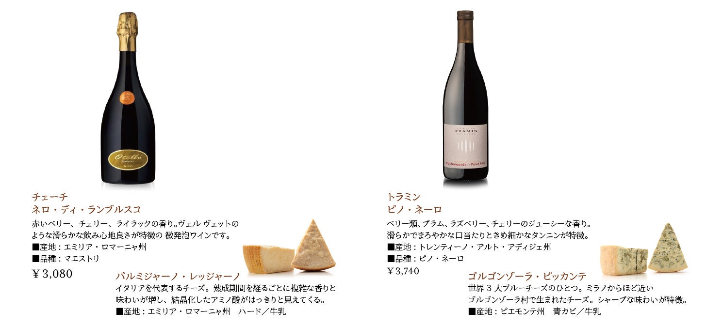 これらの料理とはもちろんのこと、北イタリアのチーズとのアッビナメントを楽しませてくれるワインもご用意しています。