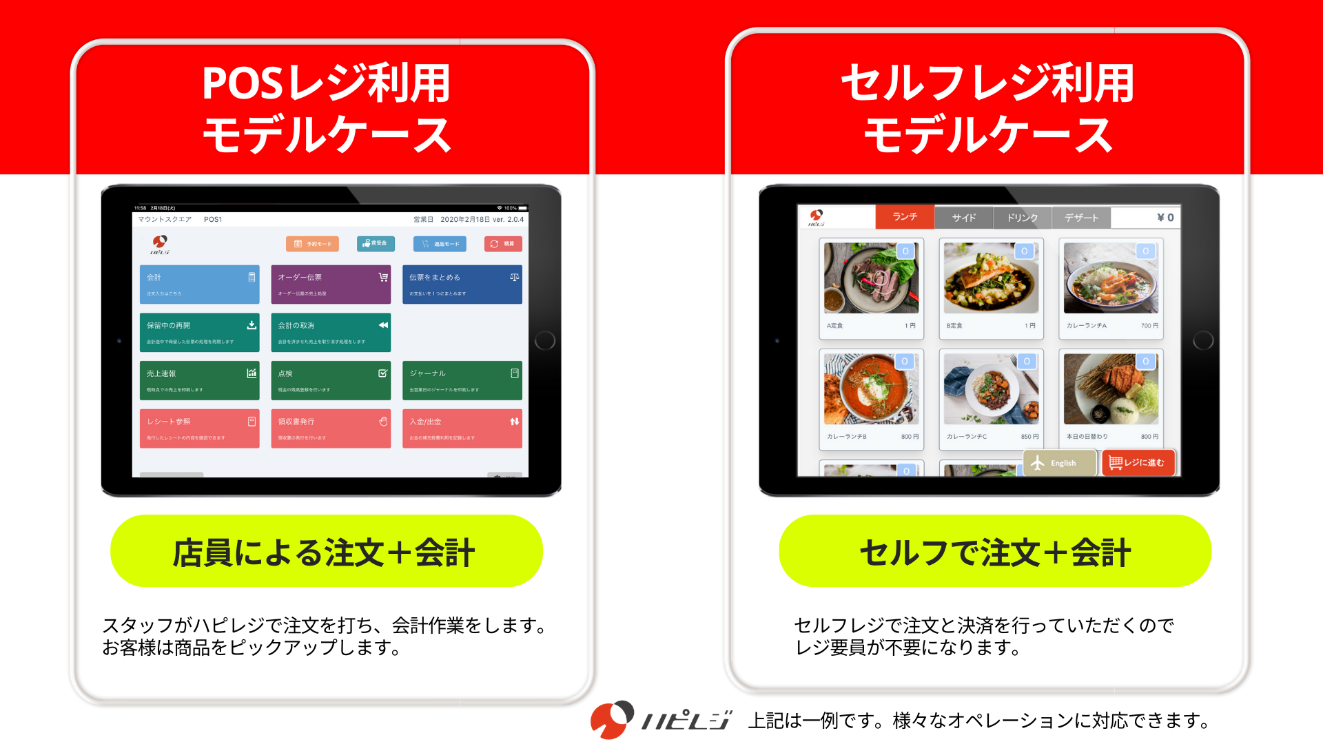 スタッフさんが注文受けとレジ会計を行うPOSレジ利用ケースと、セルフ注文とセルフ決済を行うセルフレジ利用どちらでも選択が可能です。レストランカフェ等の飲食店だけでなく、学食、社食、売店、無人店舗、リゾート施設などでも幅広く導入いただいています。