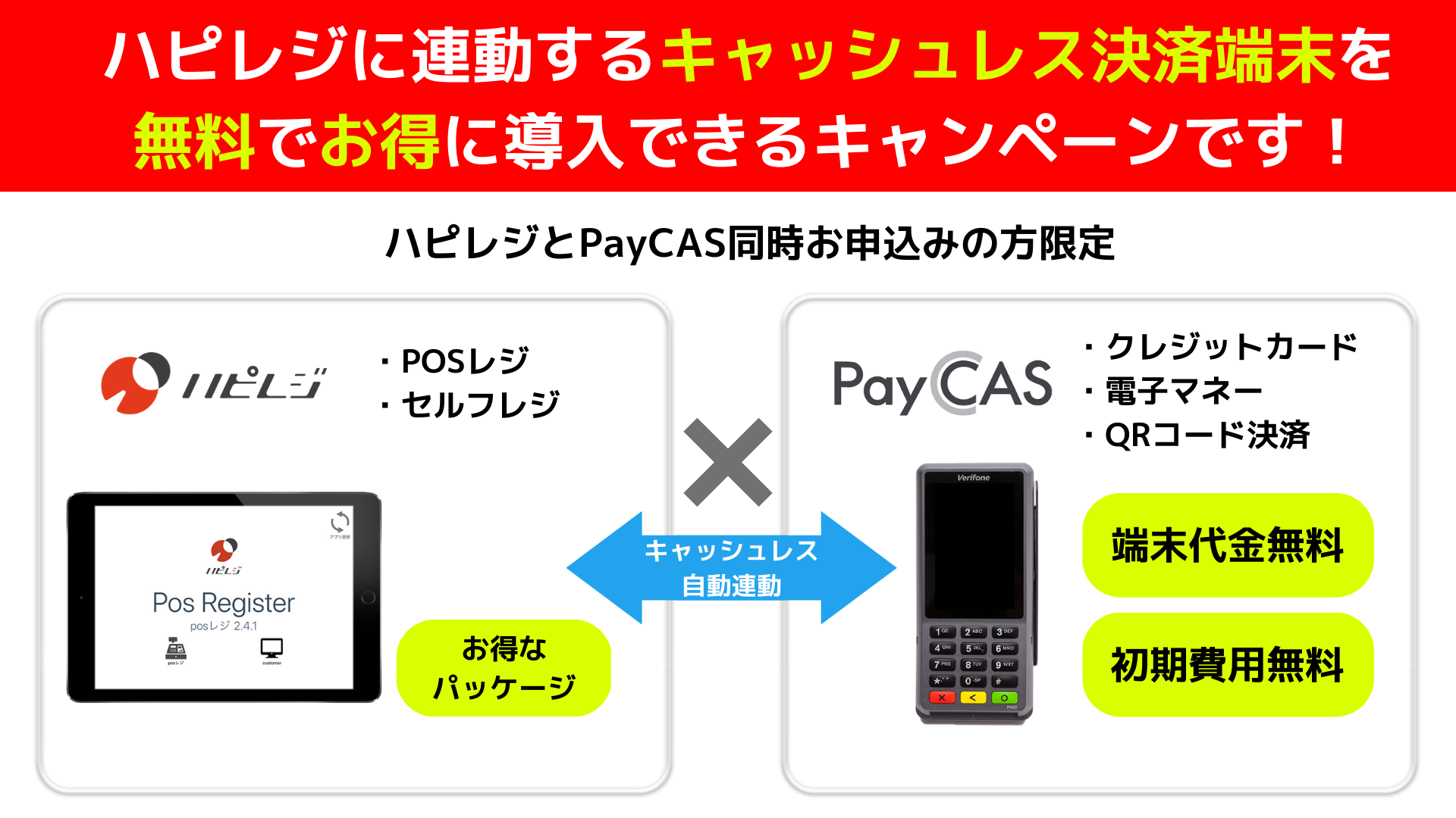 そこで、ハピレジ×PayCASは、キャッシュレス決済端末を無料で導入できるキャンペーンをご用意しました!この機会にぜひ、初期コストを抑えて、店舗DXを推進しませんか?