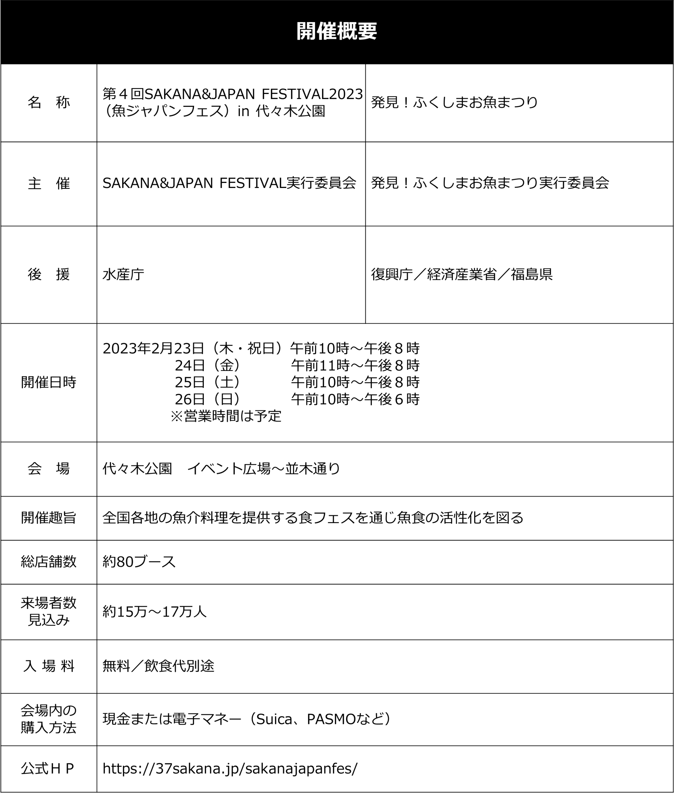 - SAKANA&JAPAN FESTIVAL(魚ジャパンフェス)全国各地の魚介&ご当地グルメが大集合!