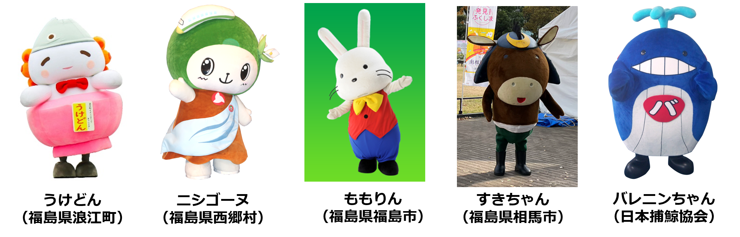 福島県各地のご当地キャラクターやマスコットが勢ぞろい。愛らしいゆるキャラたちが、SAKANA&JAPAN FESTIVALを盛り上げます。会期中は、会場を歩いたり、それぞれのブースで料理を売り込んだりするほか、ステージにも登場します。