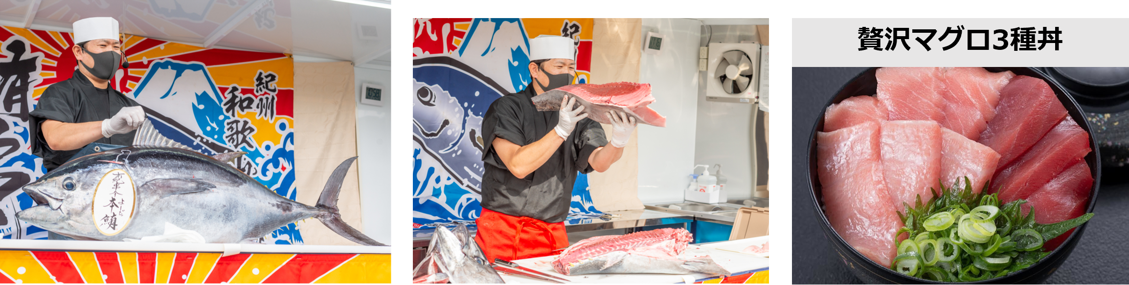 紀州・和歌山のマグロ専門店「黒潮市場」が出店。生マグロの水揚量日本一を誇る勝浦漁港から直送した生の本マグロを、来場者の目の前で解体し、さばきたての超新鮮なマグロの海鮮丼を提供します。和歌山市にある「黒潮市場」は、毎日マグロの解体ショーが行われている人気のマグロのテーマパーク。マグロを知り尽くしたプロが、水揚げされたばかりのマグロの中から、脂がのったものを厳選して調達。お薦めは大トロ、中トロ、赤身が食べ比べられる「贅沢マグロ3種丼」。さばきたてのマグロの味わいは格別です。解体ショーは毎日3回実施。