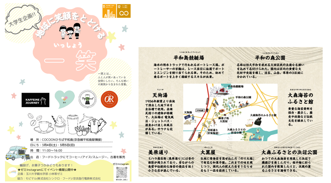 ※イベントチラシ。裏面(右)には、学生たちが調べた周辺のおすすめスポットをMAPで紹介