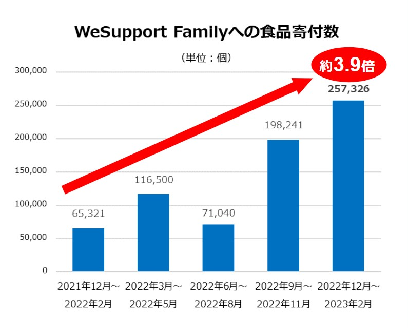 WeSupport Familyに食品寄付をするサポート企業は全51社(参考:次頁、サポート企業一覧)となり、2022年12月〜2023年2月の食品寄付数は257,326個と、昨年対比で約3.9倍に伸長しています。