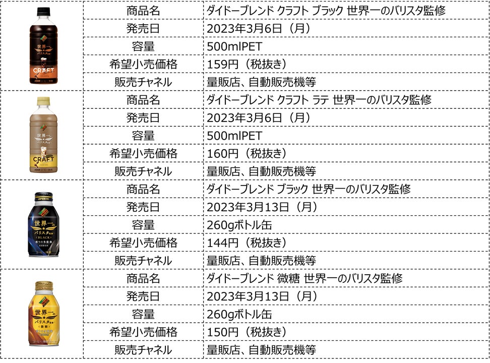 ダイドードリンコ株式会社は、2023年春夏の新商品として、「ダイドーブレンド クラフト ブラック 世界一のバリスタ監修」、「ダイドーブレンド クラフト ラテ 世界一のバリスタ監修」を3月6日(月)より、「ダイドーブレンド ブラック 世界一のバリスタ監修」、「ダイドーブレンド 微糖 世界一のバリスタ監修」を3月13日(月)よりそれぞれ発売いたします。