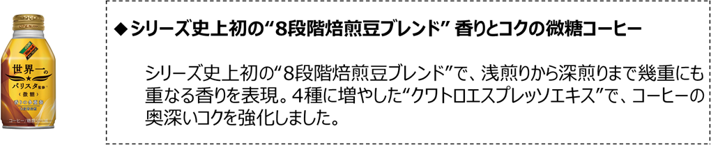 「ダイドーブレンド 世界一のバリスタ監修」シリーズは、バリスタのあくなき探求心から生まれた、こだわりのおいしさを貫くコーヒーをお届けし、コーヒー本来の味わいを好まれるお客様を中心に大変好評をいただいております。
