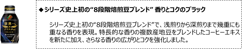 この度、2023年春夏の新商品として発売するのは、雑味を除き、コーヒーのおいしさをいいとこどりする絹磨き製法と、こだわりの焙煎豆ブレンドによる上質なクラフトコーヒー、「ダイドーブレンド クラフト ブラック 世界一のバリスタ監修」、「ダイドーブレンド クラフト ラテ 世界一のバリスタ監修」。そして「世界一のバリスタ監修」シリーズ史上初の“8段階焙煎豆ブレンド”で、浅煎りの華やかな香りから、深煎りのロースト香まで、幾重にも重なる香りが特長の「ダイドーブレンド ブラック 世界一のバリスタ監修」、「ダイドーブレンド 微糖 世界一のバリスタ監修」です。