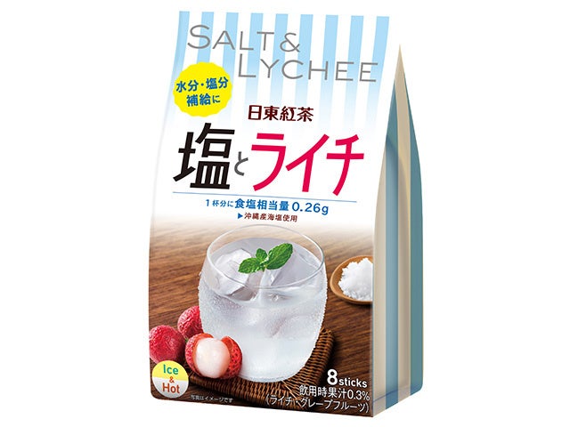 近年、夏場においてスポーツ時や外出時だけでなく、日常的に水分・塩分補給を意識した熱中症対策が重要となってきています。そこで今回、熱中症対策※商品としての訴求を強め、「塩とライチ」の商品名が目立つようにパッケージを一新します。沖縄産海塩を効かせた味わいとライチの香りが口の中に広がります。個包装なのでご家庭にストックしやすく、水分・塩分補給が気になった時に、さっと水に溶かすだけで日常的に熱中症対策※していただけます。