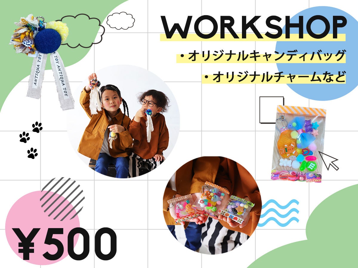 その他、キャンディーバッグや布パーツやボンボン等でつくるオリジナルチャームやヘアゴムといったハンドメイドが親子で一緒に楽しめるワークショップや、ふだんからantiquaの洋服を愛用してくださっているりんあんちゃんが一緒に商品を選んでくれるPOPUP SHOPもオープン。POPUP SHOPでは、antiquaのECサイトで売り切れになっている大人気のりんあんちゃんコラボ商品も並ぶ予定。matsukoさんからコーデを組むポイントや、育児トークも聞けちゃうかも!?