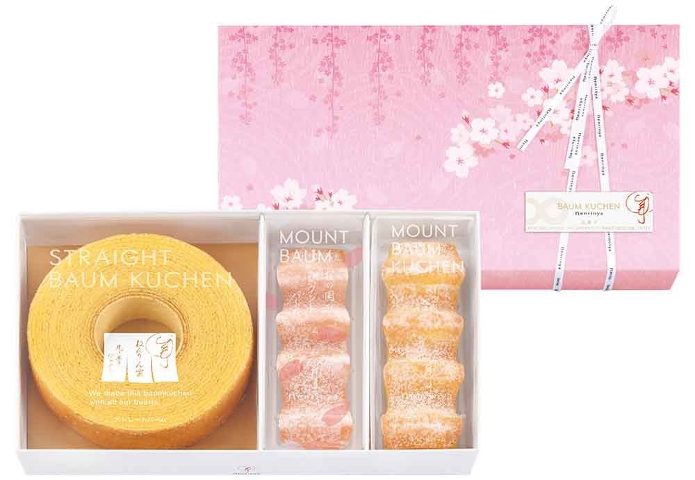 ねんりん家、春の詰合せ。濃厚なバター香る代表作「マウントバーム しっかり芽」。ほのかに桜香る春限定「桜の国のマウントバーム」。ふっくらジューシーな「ストレートバーム やわらか芽」。