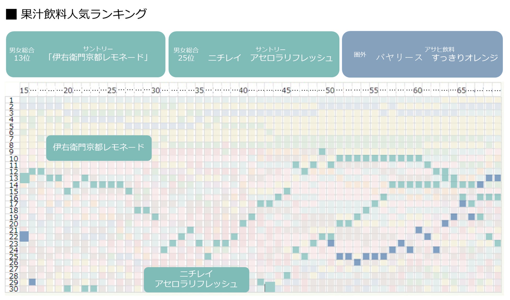 総合ランキング1位はサントリー「サントリー天然水 きりっと果実オレンジ&マンゴー」、2位はキリンビバレッジ「世界のKitchenからソルティライチ」、3位はアサヒ飲料「Welch’s 1房分のぶどう」がランクインしました。ビタミンやポリフェノールを摂取できるものから熱中症対策ができるものまで、味だけではなく摂取できる栄養素もさまざまでした。性別や年齢によって購買する商品がどのように変化するのか、商品ごとに1歳刻みのランキングを読み解きます。