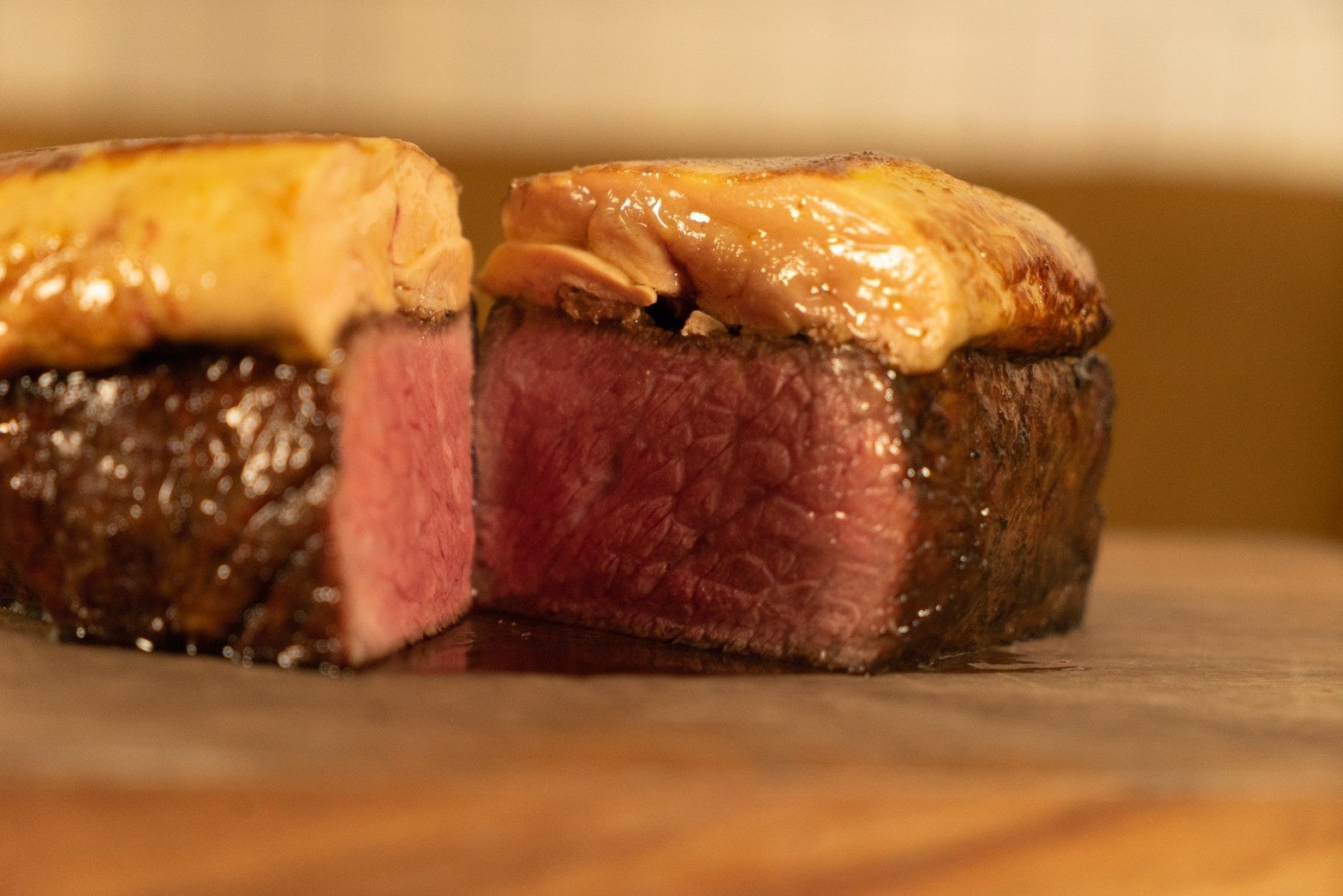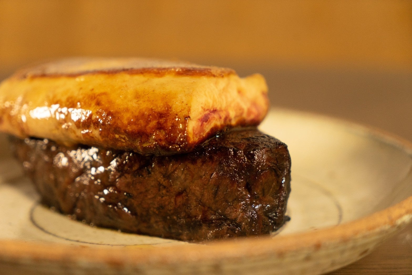 旨味爆発、肉厚フォアグラと黒毛和牛の薪焼ステーキが一皿に集結。