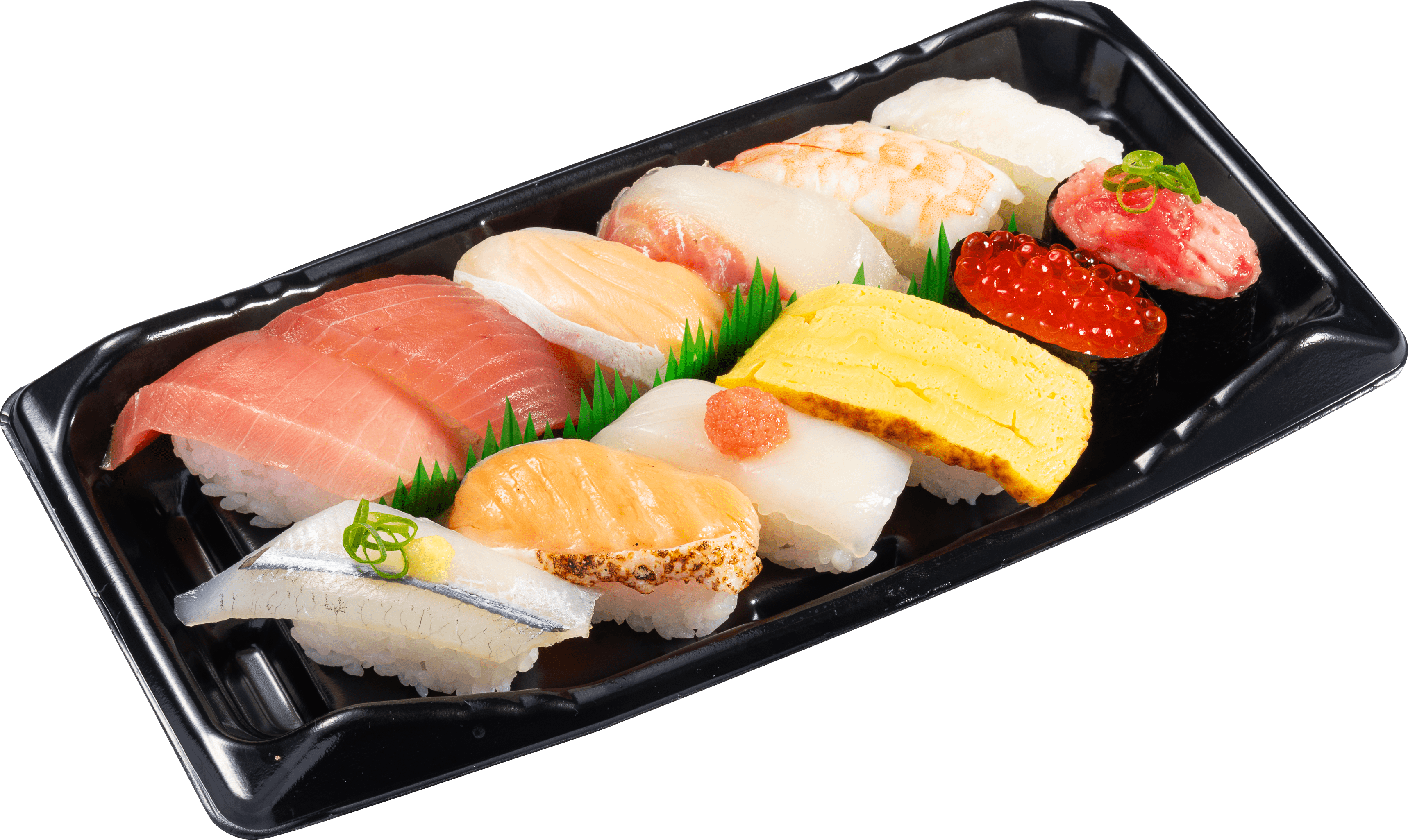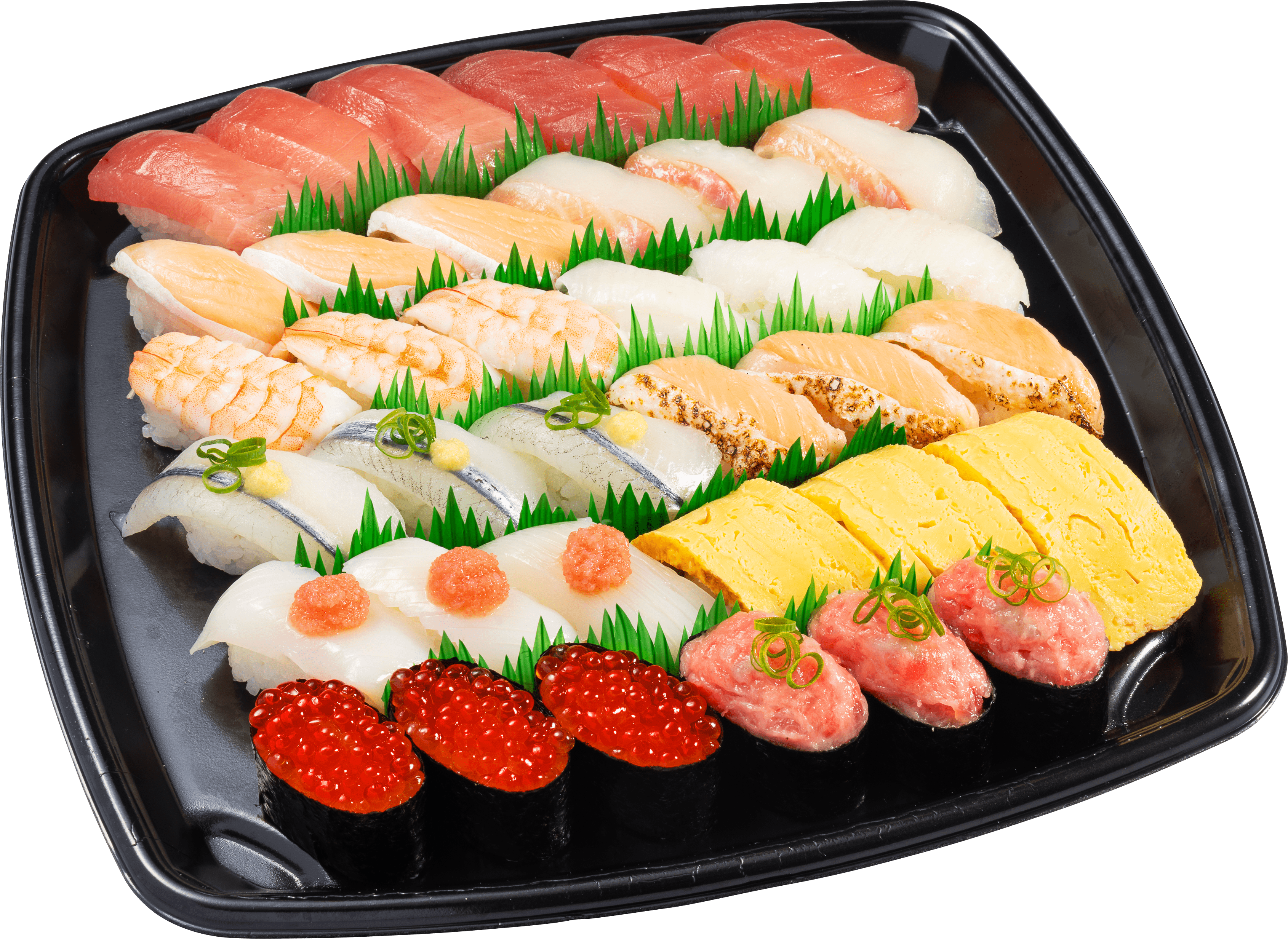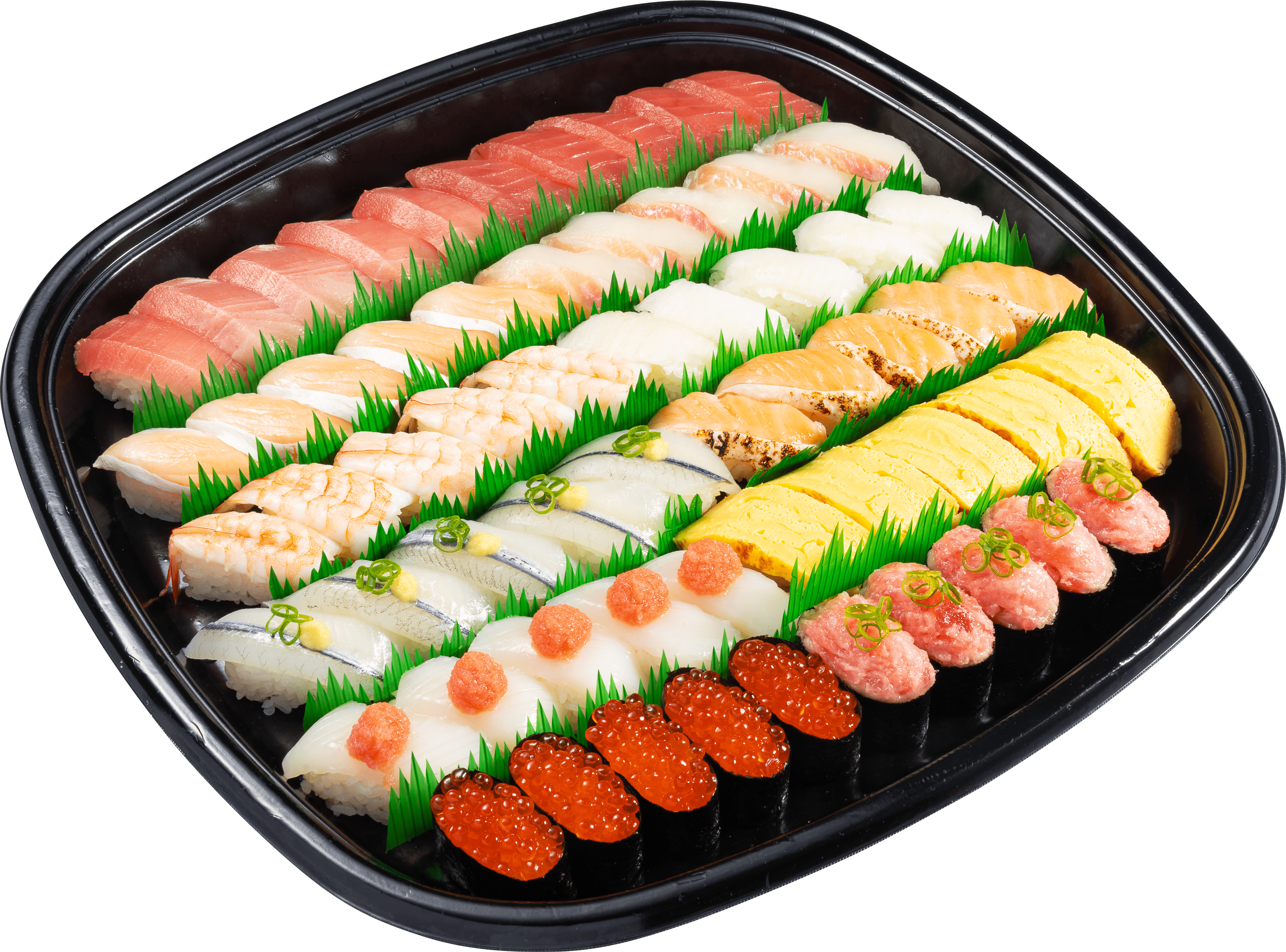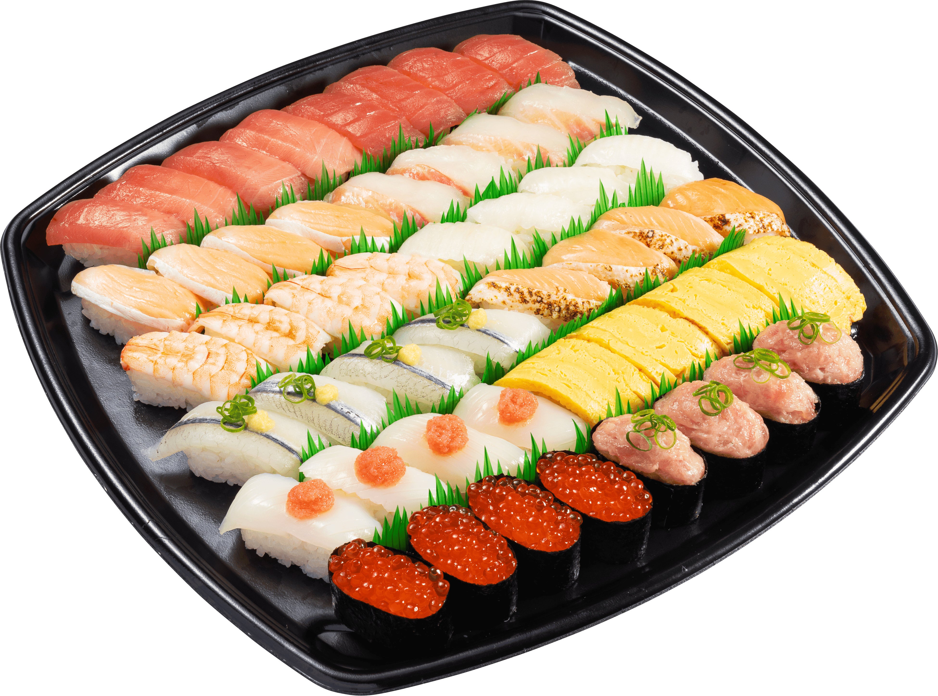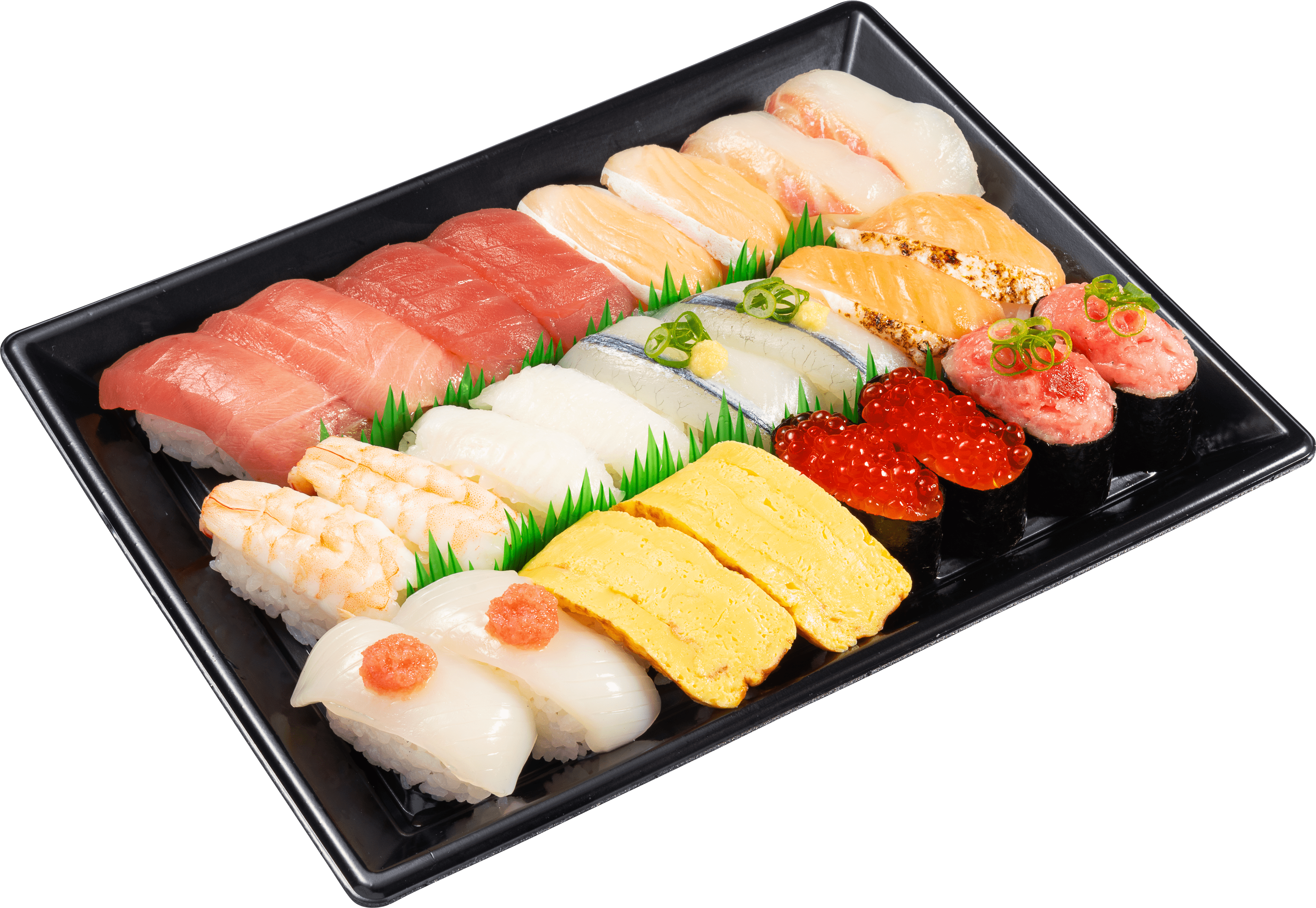 ・中とろ・まぐろ・とろサーモン・活〆真鯛・えび・えんがわ・天然さより・焼きサーモン・真いかたらこのせ・