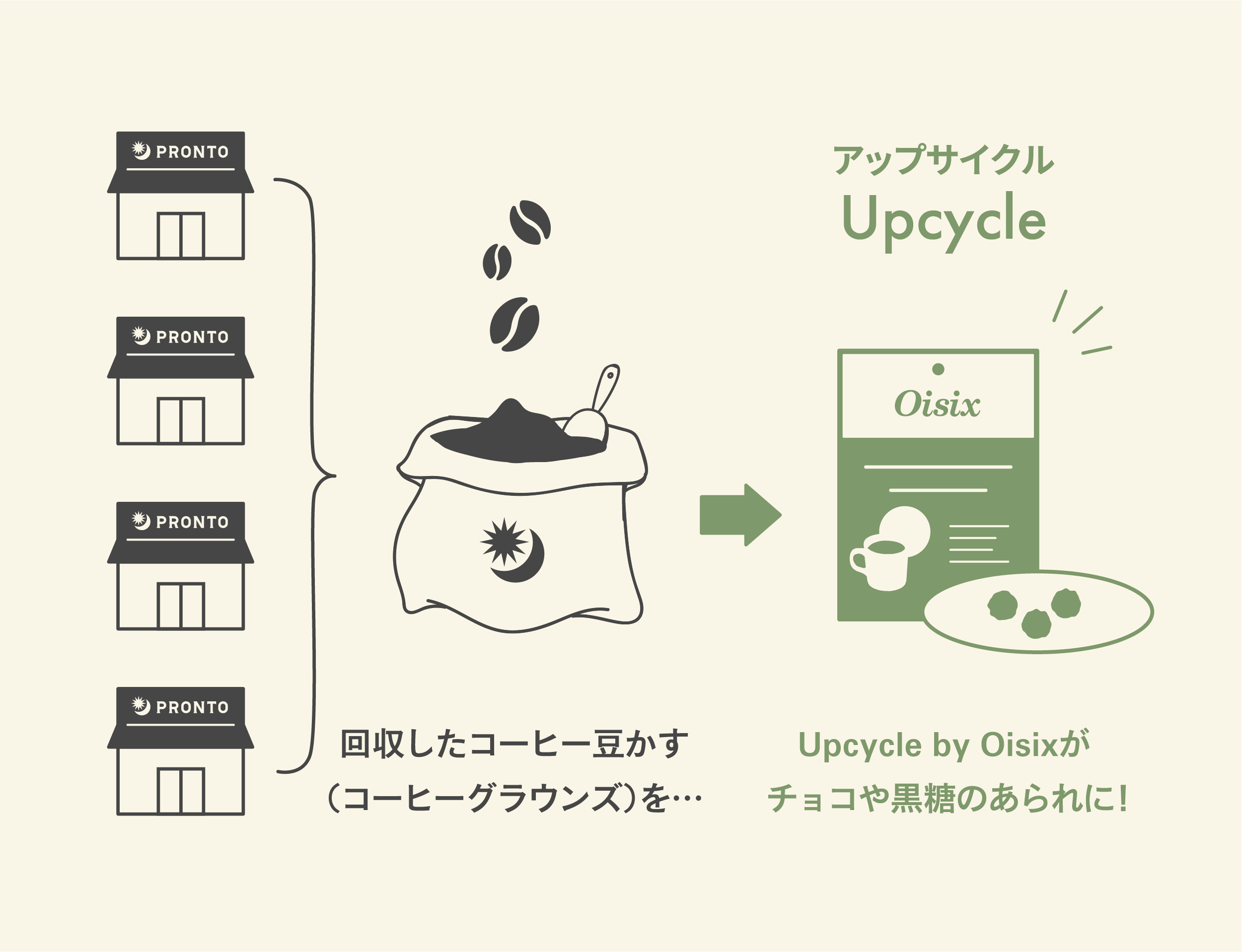 プロントコーポレーションでは、過去に店内の壁面にコーヒー豆かすを再利用したり、コーヒー豆かすからできた植木鉢「CAFE TSUCHIKO」を開発するなど、サステナブルな活動に積極的に取り組んできました。また、全日本コーヒー協会は抽出後のコーヒー粉の有効活用を推進していきたいと考えており、一般にこれまで「コーヒーかす」と呼ばれていたものの呼称を「抽出後のコーヒー粉」もしくは「コーヒーグラウンズ」とすることを提案し、普及啓蒙に取り組む発表もしており、Upcycle by Oisixでは新商品をきっかけにその後押しにもなればと考えています。