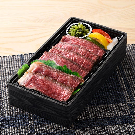 阿蘇の大自然の恵みと牧草で育った熊本の特産、阿蘇あか牛。その旨みあふれる美味しさを、贅沢なサーロイン&モモステーキのお弁当で提供。