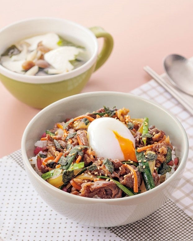 手軽に作ることができる丼でキンパ風の味わいが楽しめます。甘辛い具に、しば漬風胡瓜入りのご飯が相性抜群。とろ~り温玉とからめると、さらにご飯がすすみます!こってり味の主菜に合わせて、スープはあっさり味でヘルシーに♪