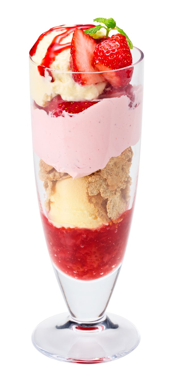 ふんわりムース、玄米フレーク、バニラアイス、苺ホイップ、フレッシュ苺を重ねパフェ仕立てに。