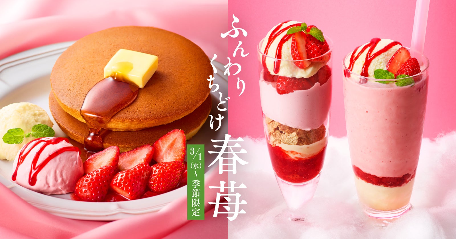 『珈琲館』と『珈琲館 蔵』より、フレッシュな苺とムースやホイップなどふんわりとした食感を楽しめるホットケーキ、フローズンドリンク、パフェが期間限定で登場します。