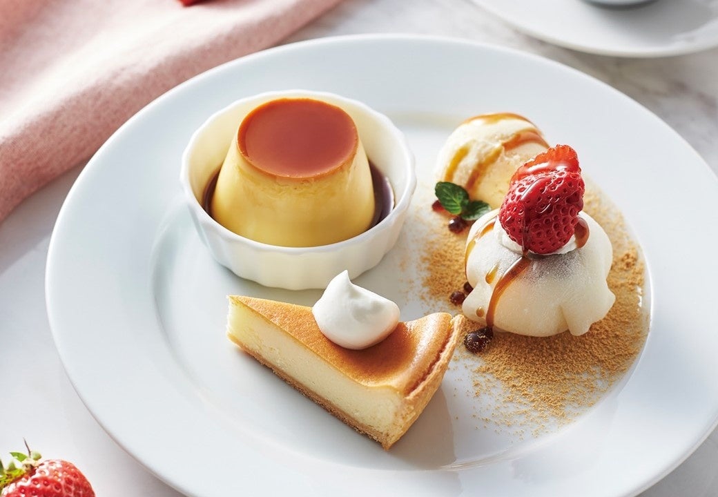 いちごのクリーム大福、バニラアイス、カスタードプリン(ミニ)、デンマーククリームチーズケーキをワンプレートに盛り合わせました。