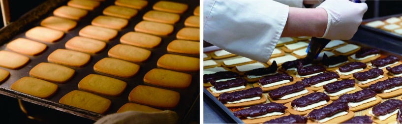 オーブンを備えた菓子工房型店舗では、ミルククッキーのサクッサク食感にこだわり、生地をカットしては焼き上げる作業を日に何度も行い、粗熱を取ったクッキーにバタークリームとつぶ餡を挟んで店頭で出来たてを提供します。店頭でお作りするのは“できたて”が一番おいしいからです。工場で大量生産し店頭に並べる方がずっと効率的ですが敢えてそうはせず、その場で食べる“できたて”の感動を楽しんでいただきたいと、手間をかけて提供いたします。