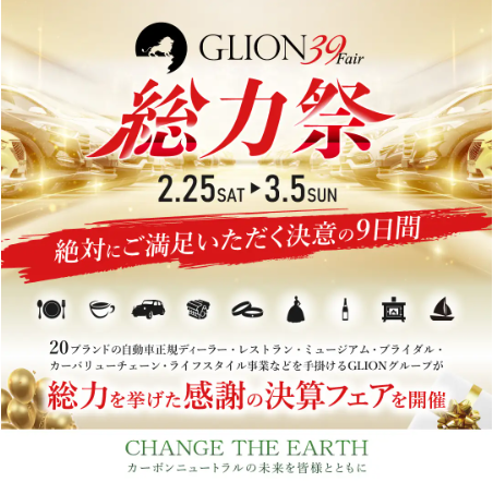そんなGLIONグループが総力を挙げ、2月25日(土)から3月5日(日)までの9日間、日頃からご愛顧いただいているお客様に感謝の気持ちを込めて開催する決算期のビッグイベント「GLION 39 Fair 総力祭」を開催します。21ブランドの新車だけではなく厳選中古車はもちろん、日常を彩る迎賓・ライフスタイル部門などGLIONグループの車以外の事業からも特別なキャンペーンを多数ご用意しております。是非この機会にGLIONグループ各店舗へお越しください。