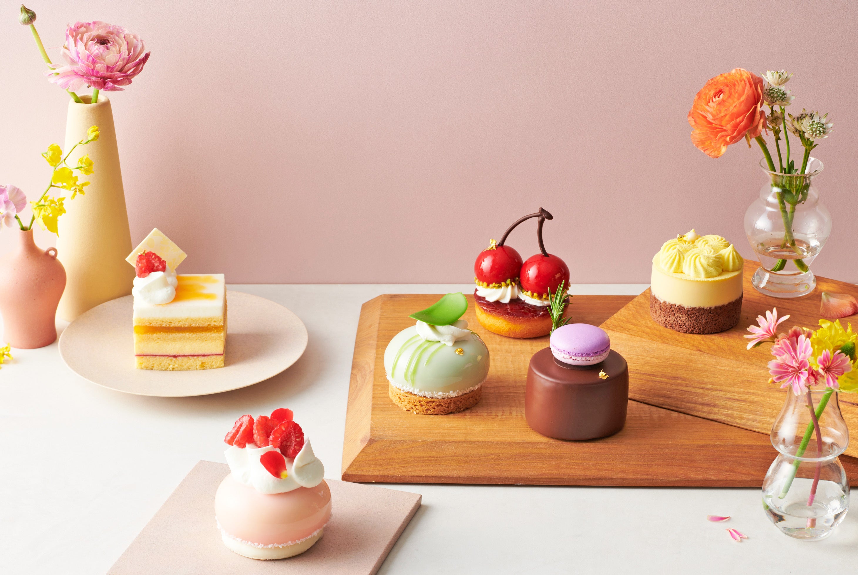 春のやわらかな風をイメージした桃のムース「春風(はるかぜ)」、可憐に咲く春の花々を表現した「すみれ」や「花の蜜」のケーキ、真っ赤に実ったつややかなムース「さくらんぼ」など、春の訪れを感じる色とりどりのケーキをご用意いたします。 春の味わいをどうぞお楽しみくださいませ。