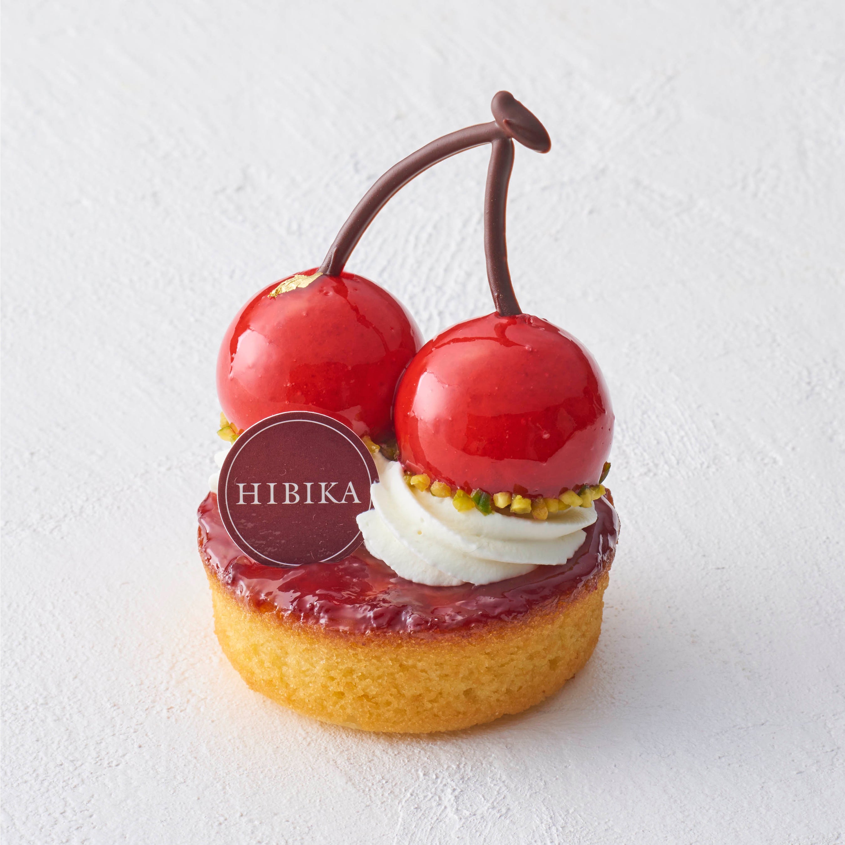 甘酸っぱいチェリーのムースで仕上げた真っ赤なさくらんぼ。香ばしく焼き上げたアーモンド生地にのせて。