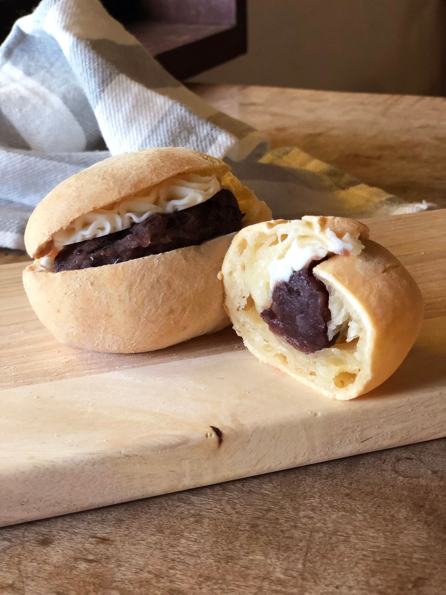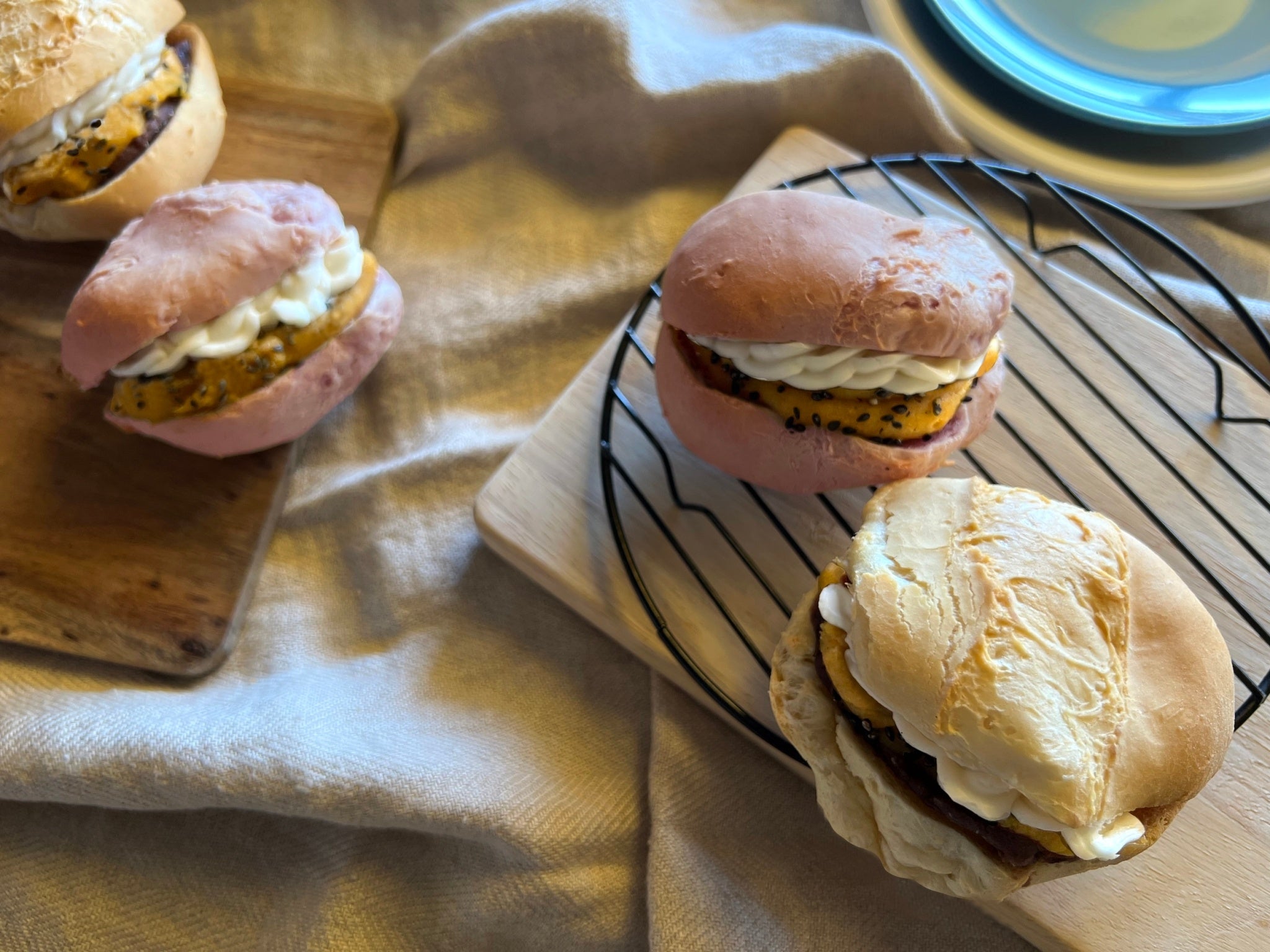 国産小倉あんと大豆バターに加え、安納芋ペーストを豆乳もちもちぱんでサンドしたちょっぴり贅沢なあんバターサンドです。