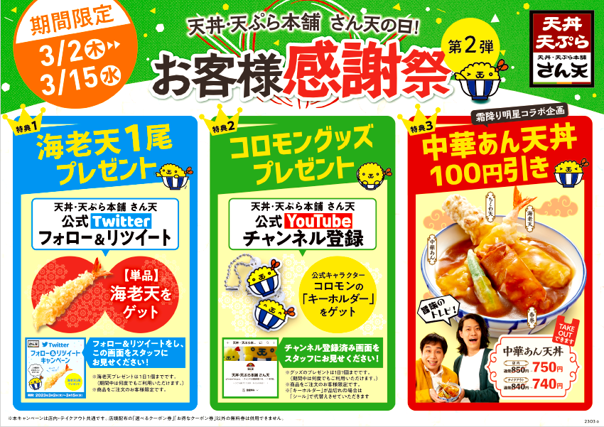 ≪天丼・天ぷら本舗 さん天の日!お客様感謝祭!≫は2月24日(金)~3月15日(水)まで開催します。