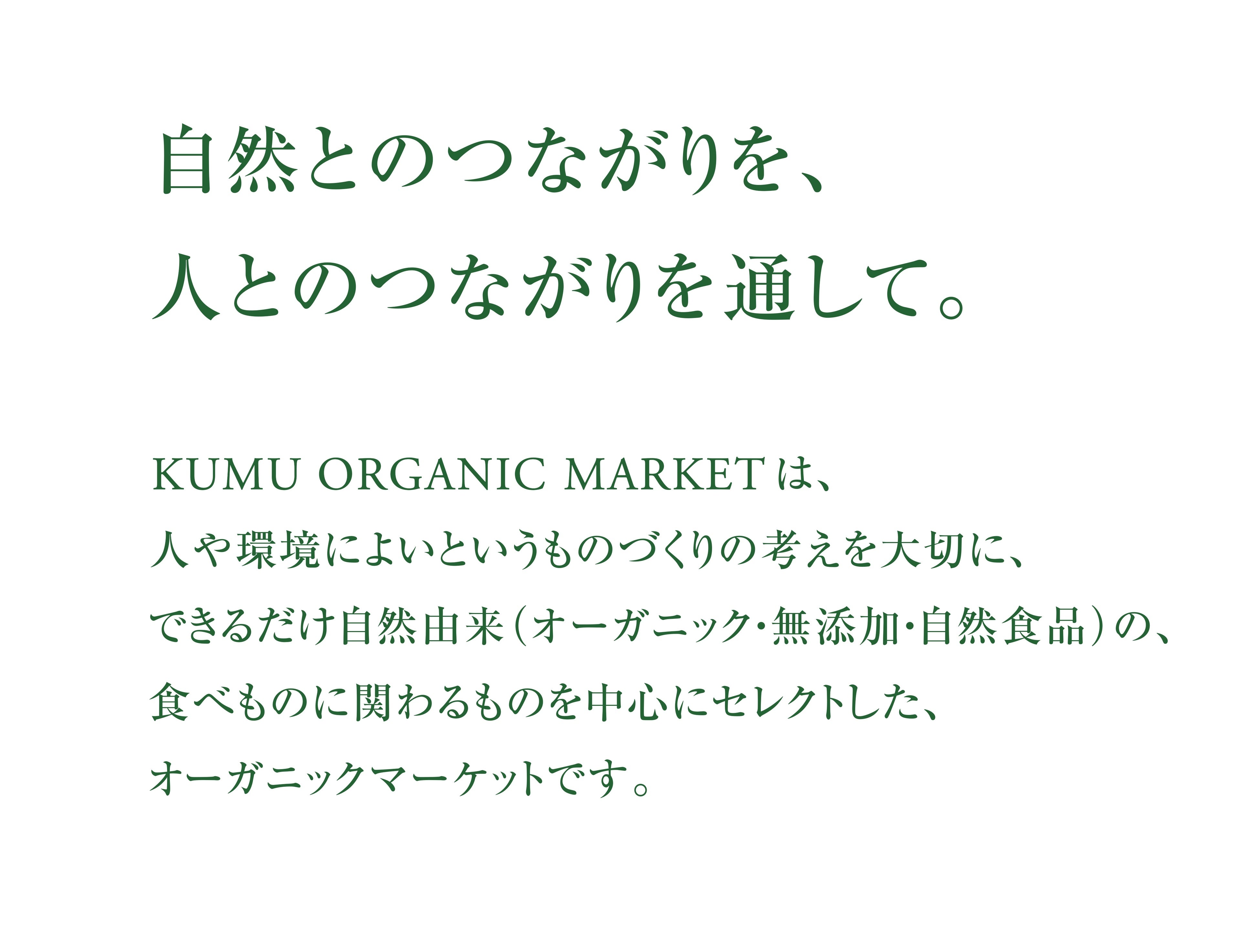 オーガニック食品、商品が諸外国で推進されている昨今、日本国内でも健康やSDGsの取り組みも普及し環境問題などへの意識が高まっている中、もっとオーガニック、無添加食品や商品を身近なものにし簡単かつ安心して購入できる環境を作るため、当社は「KUMU ORGANIC MARKET」をオープンいたしました。 これからは実店舗展開を軸として、日本全国にある地域のオーガニック、無添加食品の発掘、オリジナルPB商品の企画 、開発を中心に事業展開していきます。