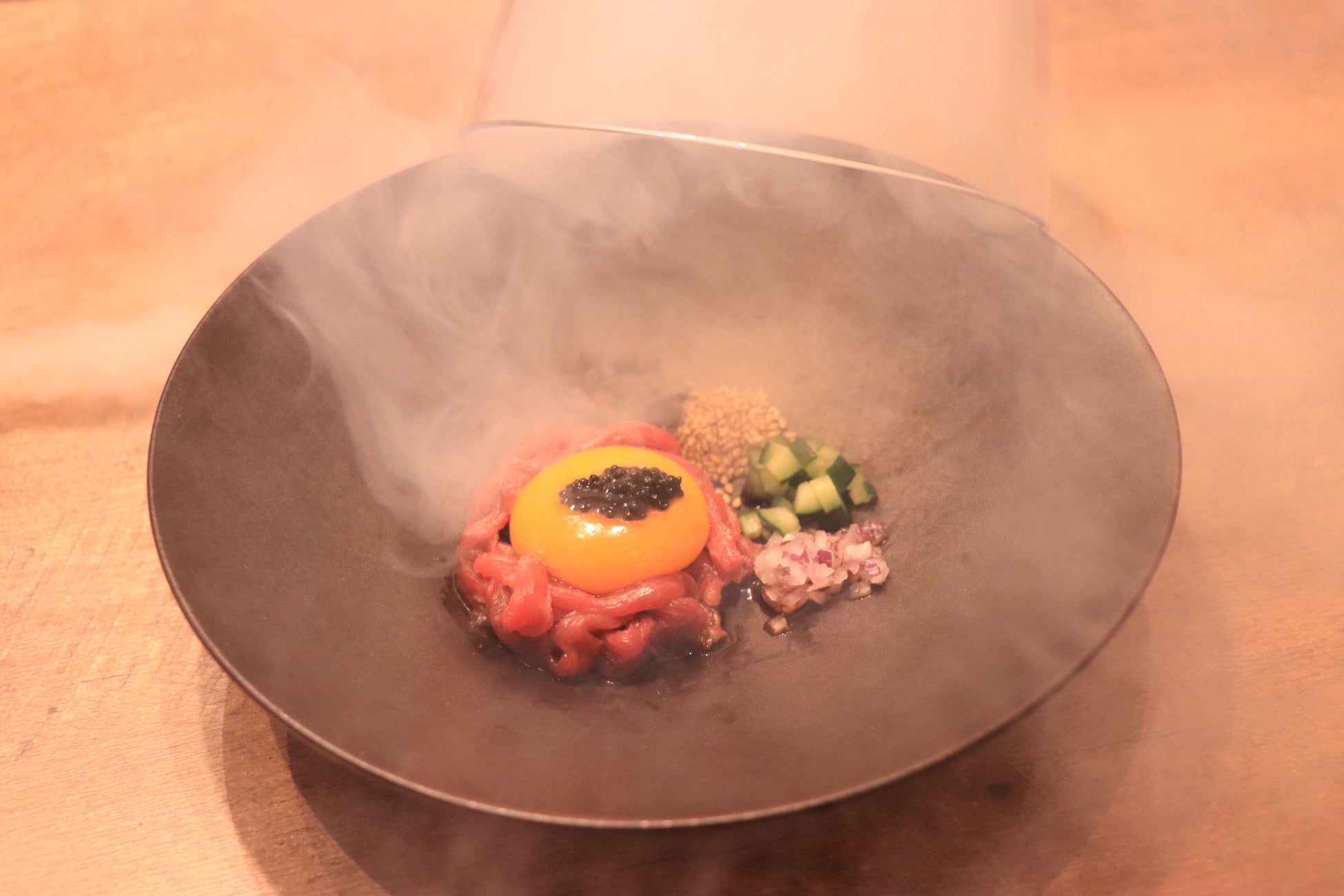 蓋を開けたら、季節を感じさせる香りのスモークが漂う演出があり、それを撮影するお客様も多くいらっしゃいます。演出を見て楽しい、そしてユッケならではの肉肉しさを存分に楽しんで頂けるこだわりメニューです。
