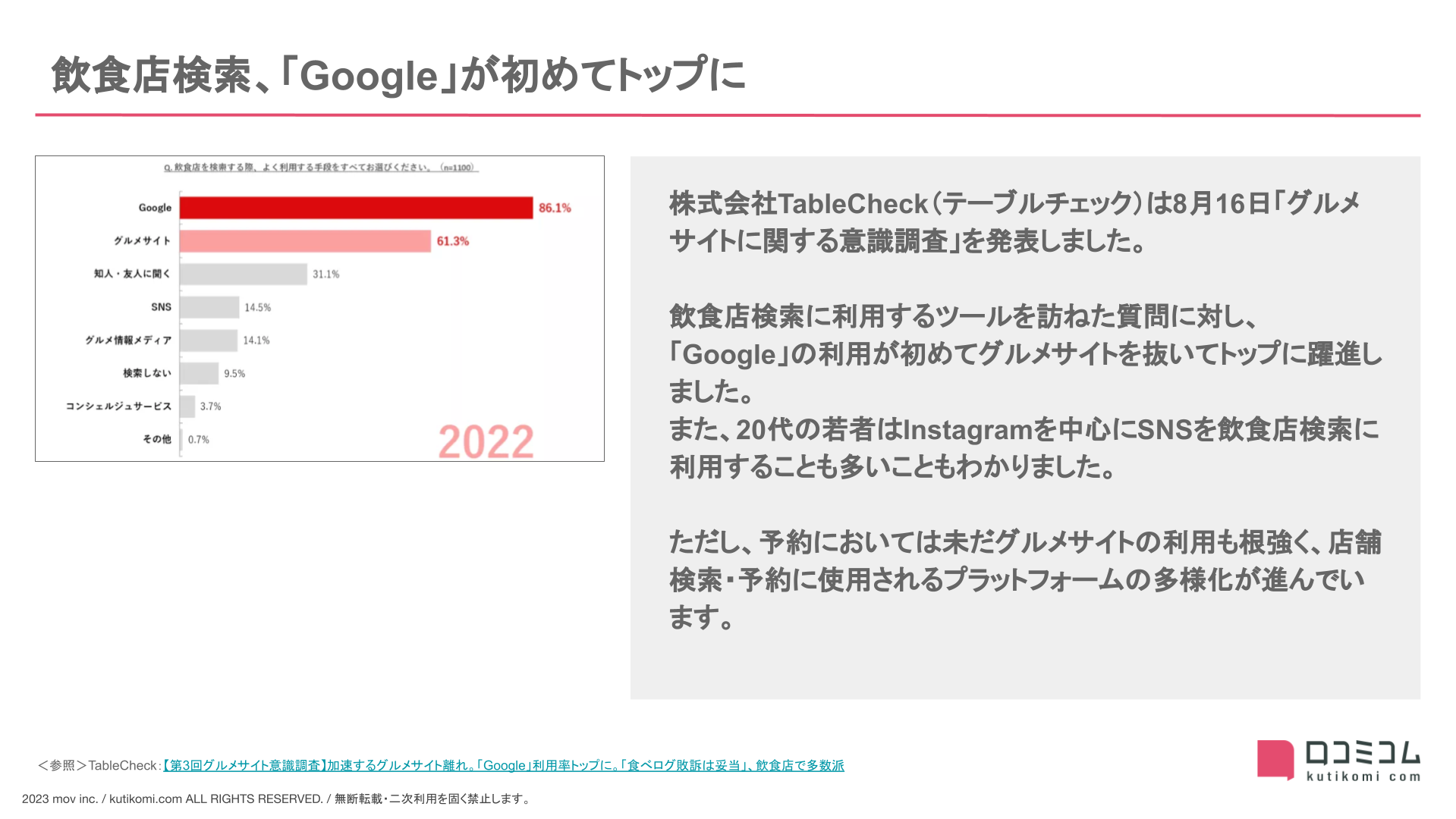 ■ 飲食業界動向2022年総まとめ:”飲食店検索「Google」トップに” ほか