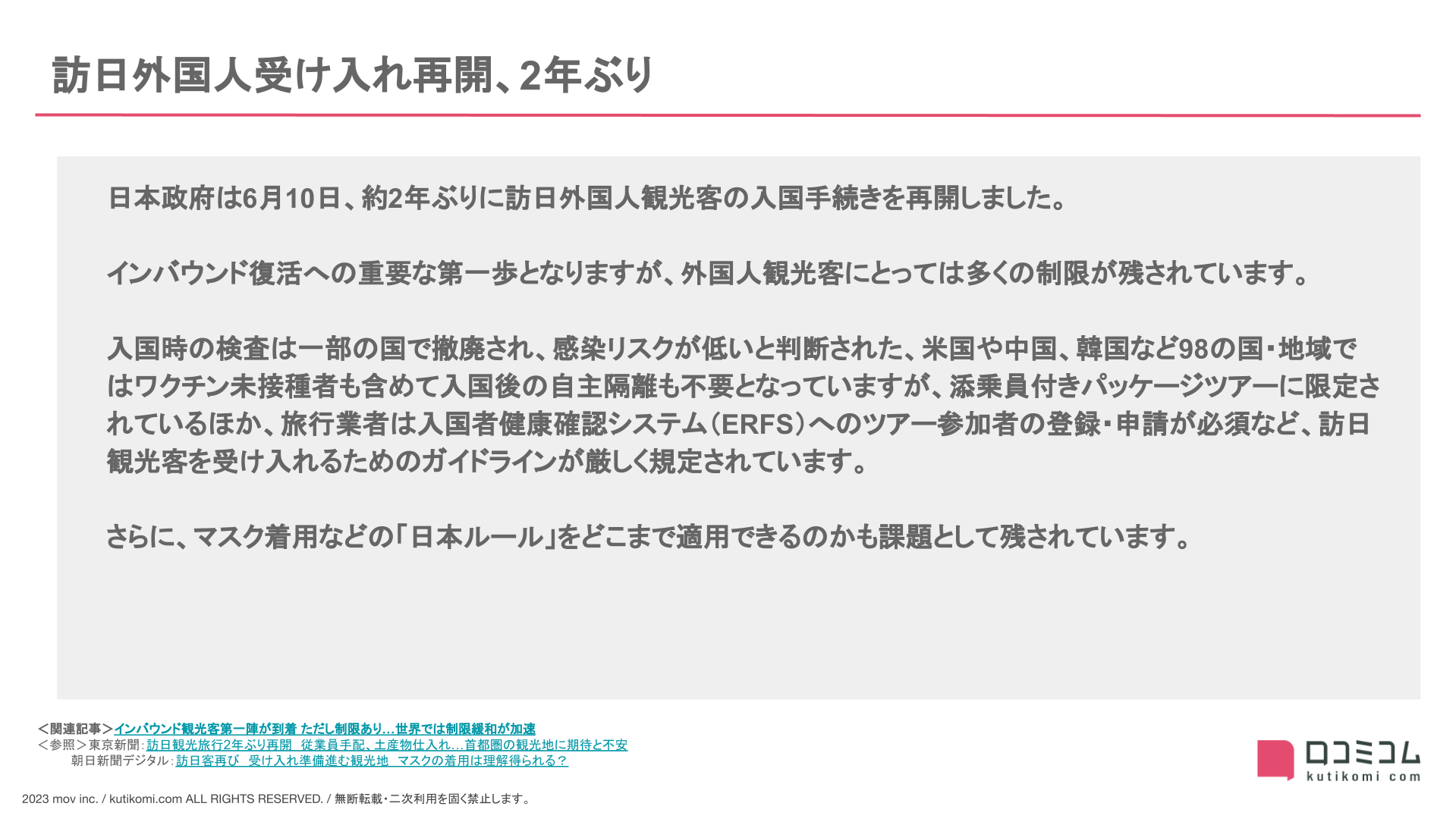 - 6月:訪日外国人受け入れ再開、2年ぶり