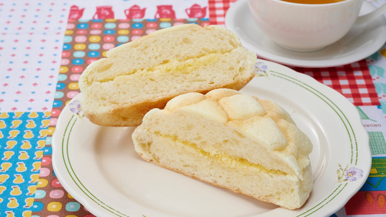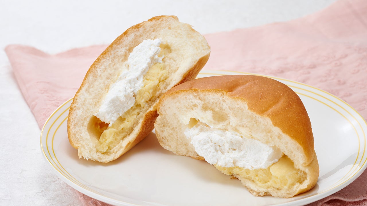 ふんわりとしたパンの中に、カスタード風クリームとホイップクリームが入ったクリームパンです。中の具材が約45%とたっぷり入っています。