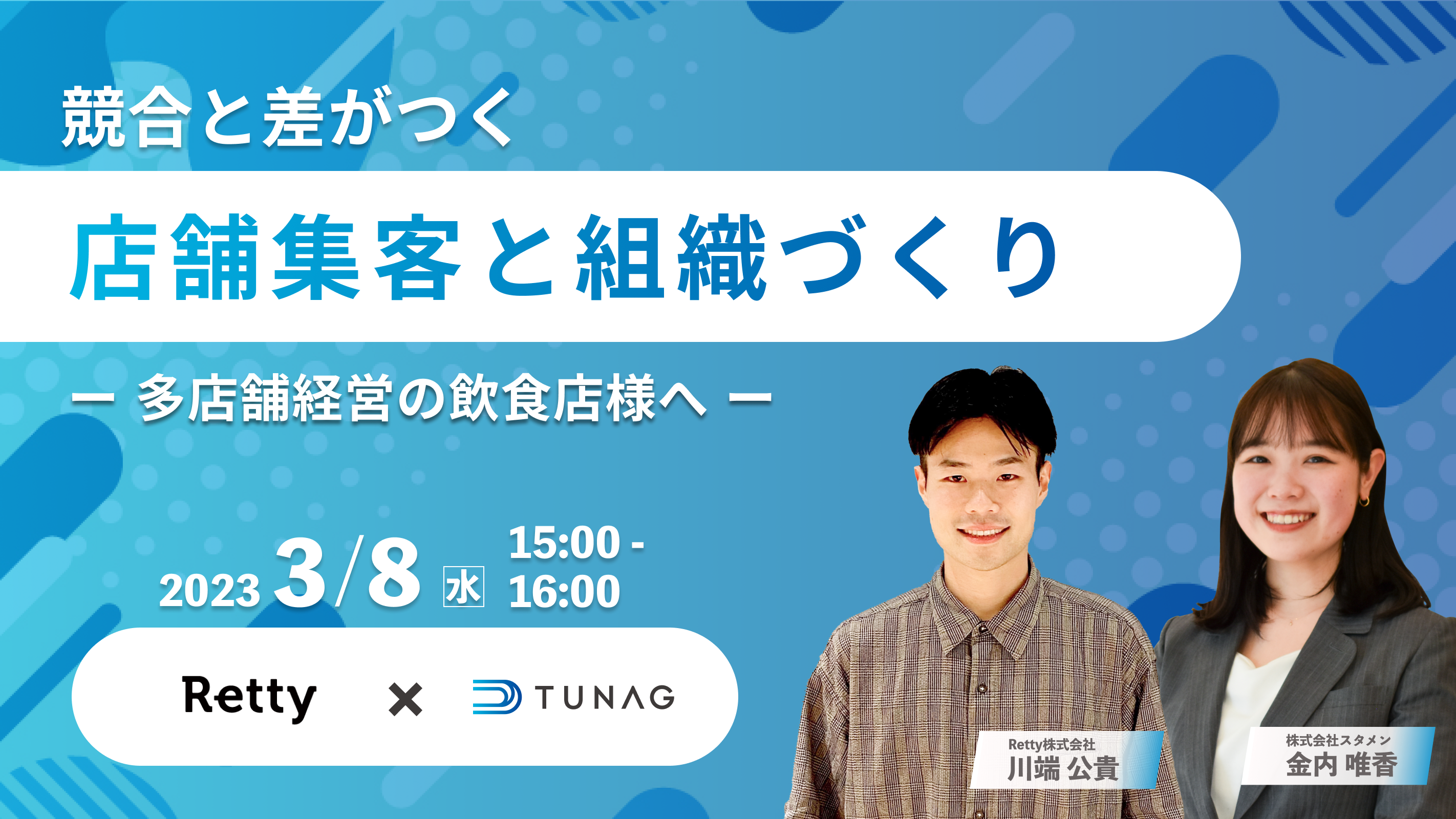 実名口コミグルメサービス「Retty」を運営するRetty株式会社(本社:東京都港区、代表取締役:武田 和也)は、エンゲージメントプラットフォーム「TUNAG」を運営する株式会社スタメン(本社:愛知県名古屋市、代表取締役:大西 泰平)と共催で、飲食店向けWebセミナー「【多店舗経営の飲食店様へ】競合と差がつく店舗集客と組織づくり」を3月8日(水)15:00〜16:00で開催します。Rettyは飲食店のみなさまがよりよい集客を実現し、Happyな食体験を生み続けられるようサポートしてまいります。