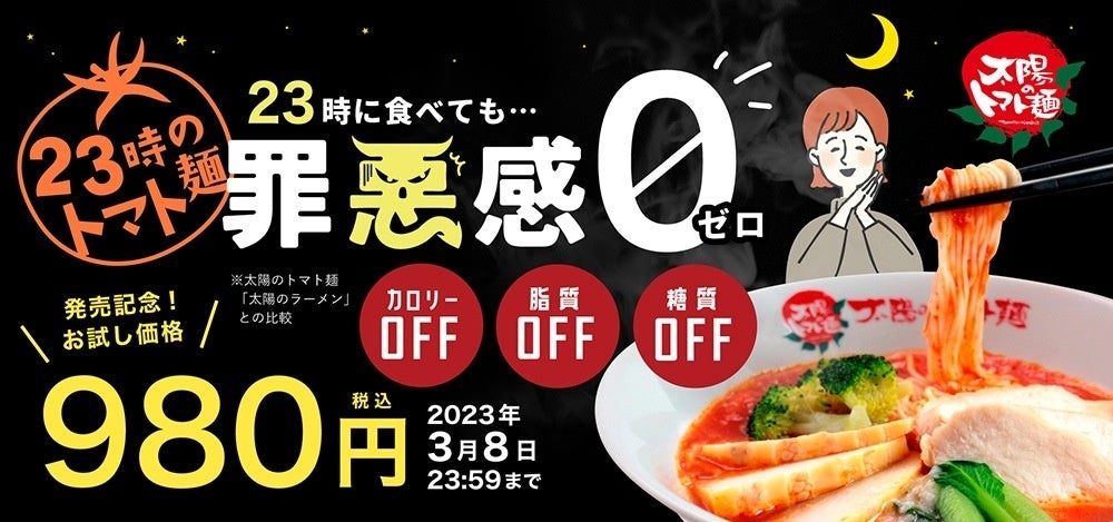トマトラーメンの専門店「太陽のトマト麺」(運営:株式会社大阪王将)は、2023年2月24日(金)よりオンラインショップにて、23時に食べても罪悪感ゼロ!『23時のトマト麺』をオンラインショップで新発売いたします。