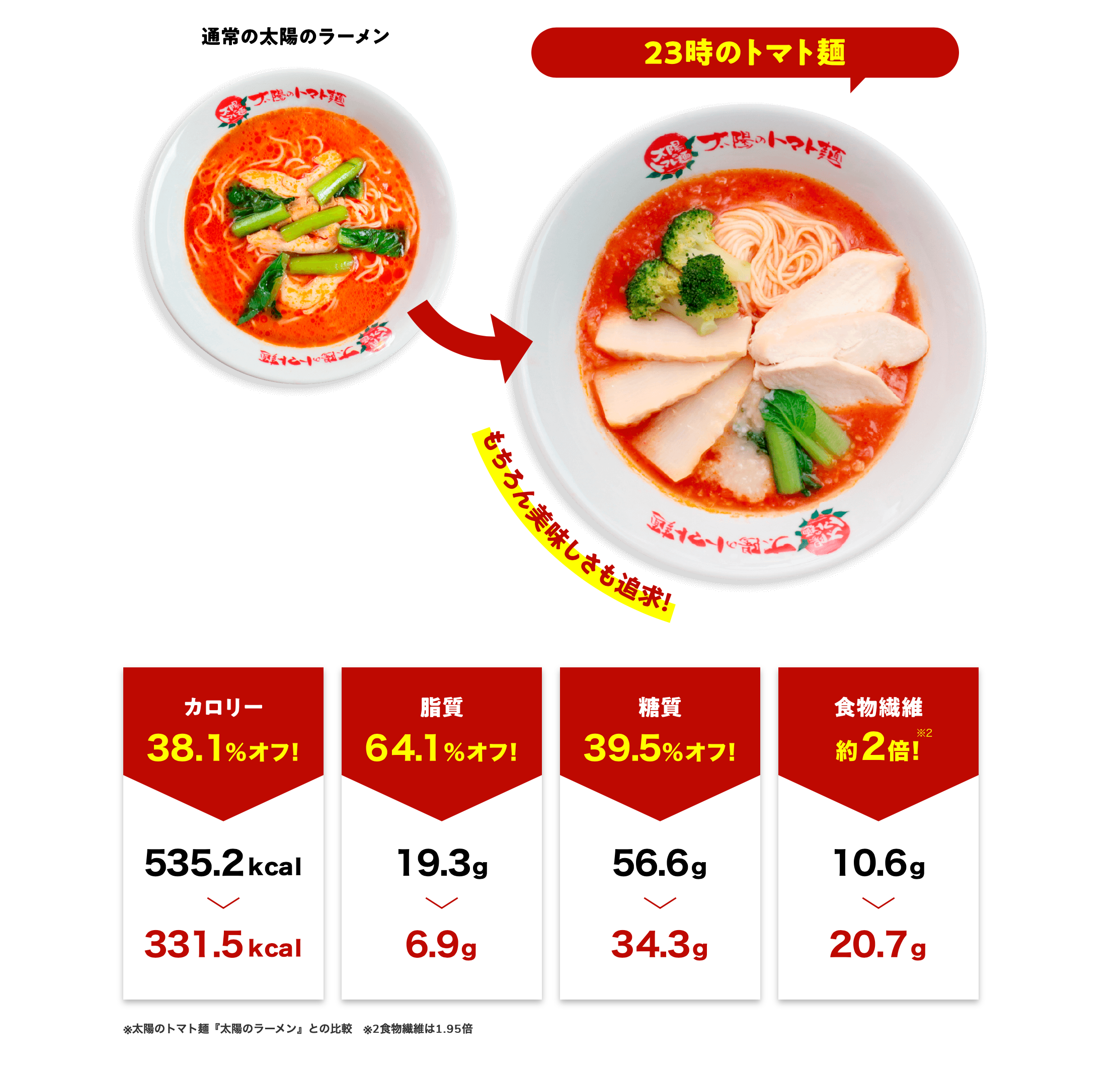 『23時のトマト麺』は、通常の『太陽のラーメン』と比べて、カロリー38.1%オフ!脂質64.1%オフ!脂質39.5%オフ、食物繊維は約2倍。
