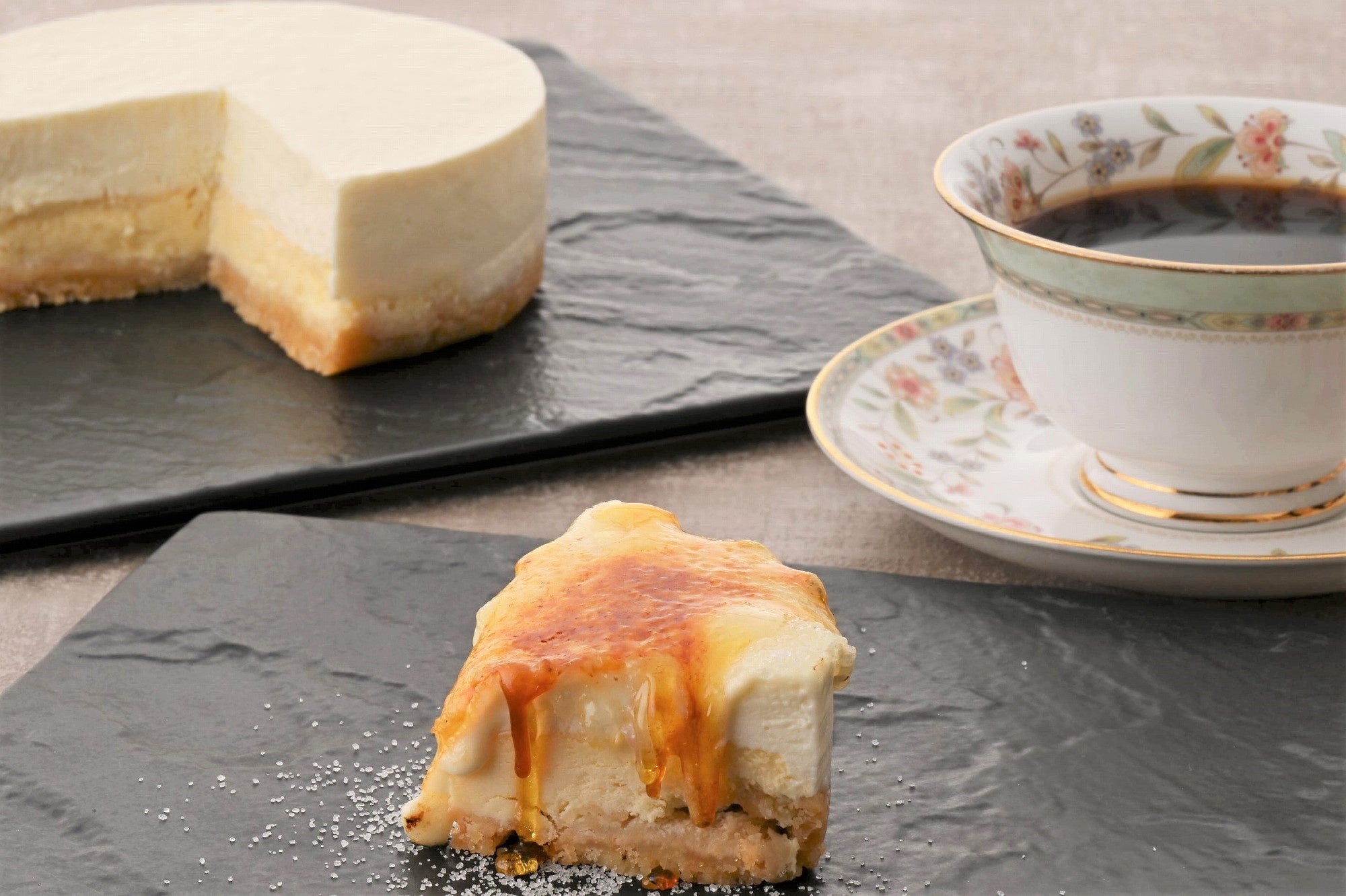 キャラメリゼするとふつふつと砂糖が焦げて香ばしく甘い香りが広がり、レアチーズケーキがとろりと溶け出す演出がお楽しみいただけます。キャラメリゼしてパリパリになった表面にふんわりととろけるレアチーズケーキ、チーズテリーヌのなめらかな舌触りにパートシュクレのサクサクとした食感で五感を満たす至福のひとときをお過ごしいただけます。