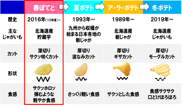 四季を巡るポテトシリーズは、季節に合った国産のジャガイモを使用し、深切りサクッ咲くカットで弾むような軽やか食感を味わえる「春ぽてと」など、ポテトチップスの形状を工夫することで季節を感じる食感や味わいを実現しております。