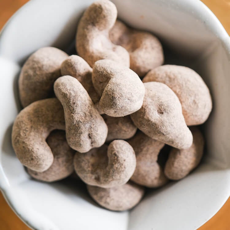 直火焙煎したカシューナッツをココアバターでコーティング、和三盆とココアパウダーをまぶして冬の装いに仕上げました。