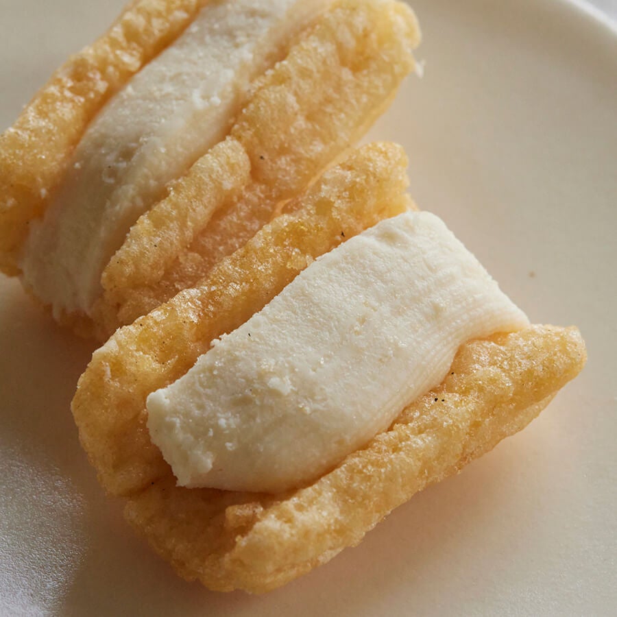 まろやかなカマンベールチーズクリームを、白だしで味つけした甘じょっぱいサクサクおかきでサンドしました。