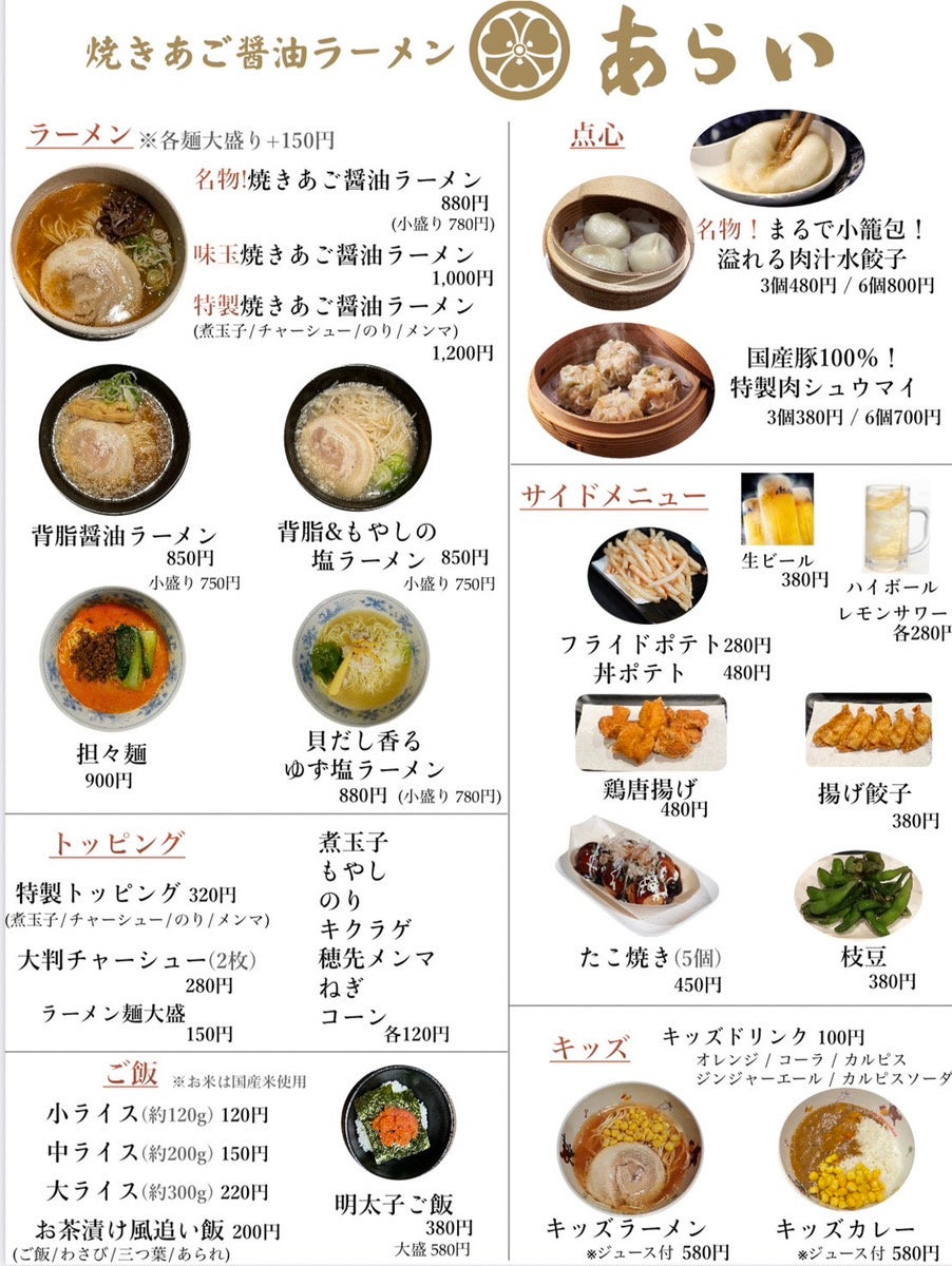 当店看板メニューの焼きあご醤油ラーメンをはじめ、人気の点心類もご用意しております!