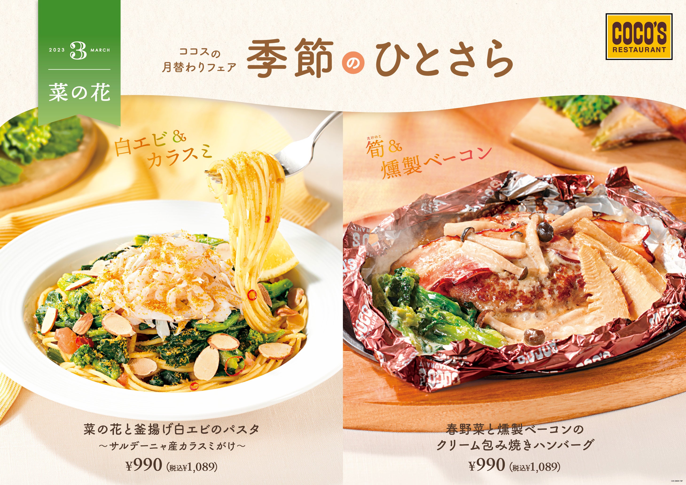 株式会社ココスジャパン(代表取締役社長:一木 直哉 本社:東京都港区)が全国に展開するファミリーレストラン「ココス」では3月1日(水)より、季節の食材“菜の花”を味わえる月替わりフェア「季節のひとさら~3月~」を開催します。