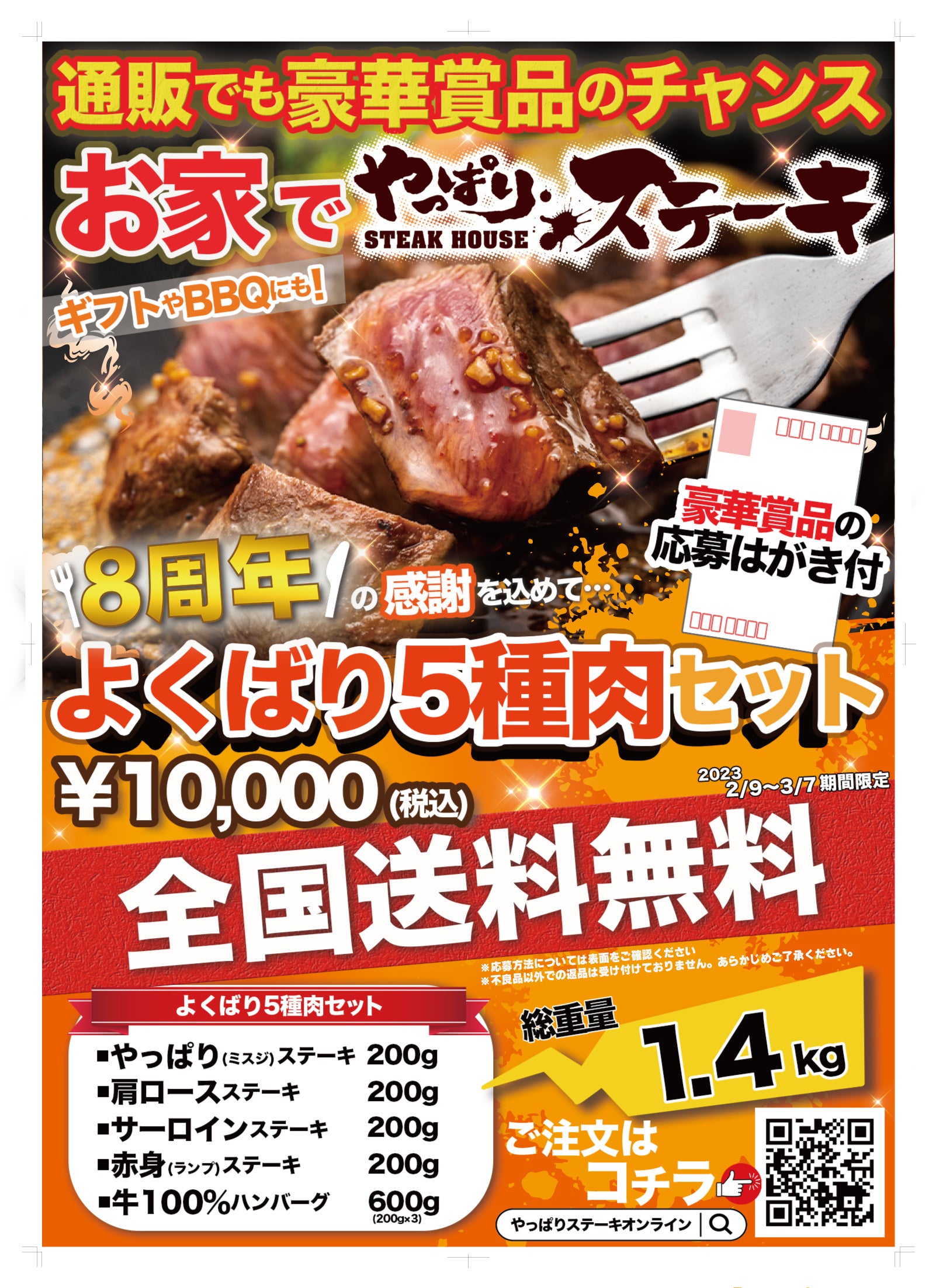 ■やっぱりステーキ公式オンラインショップにて、8周年特別セット「よくばり5種肉セット」を販売予定。