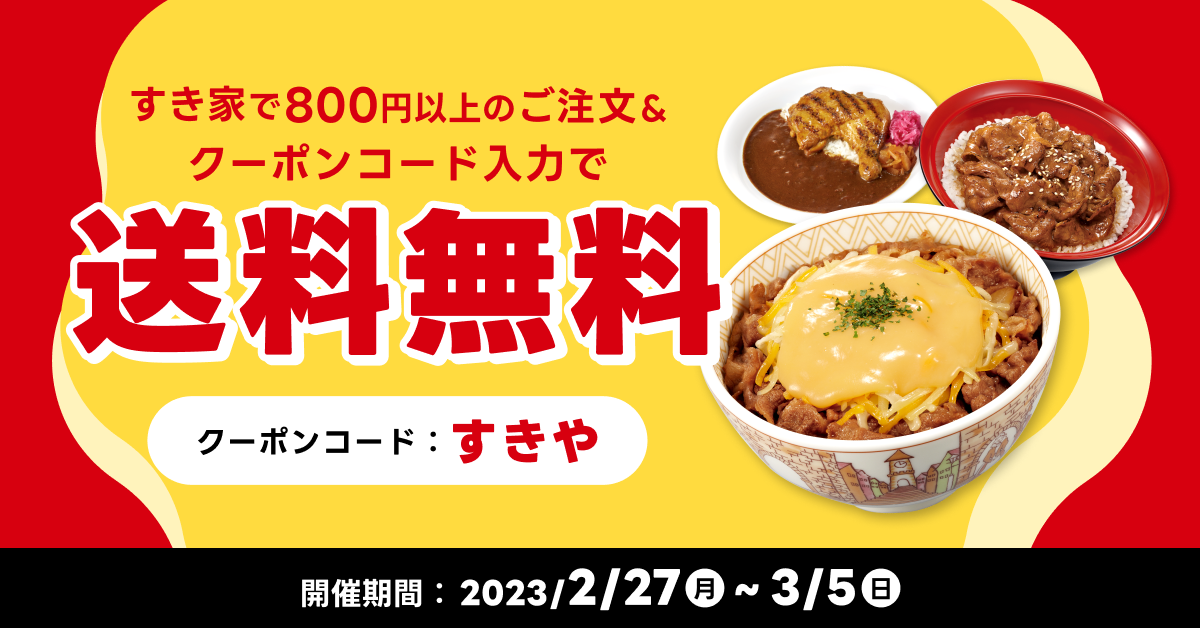 株式会社すき家(代表取締役社長:笹川 直樹 本社:東京都港区)が展開する牛丼チェーン店「すき家」は、株式会社出前館(代表取締役社長:藤井 英雄 本社:東京都渋谷区)が運営する日本最大級のデリバリーサービス「出前館」への登録1,000店舗を突破したことを記念し、2023年2月27日(月)〜3月5日(日)まで送料無料キャンペーンを実施いたします。