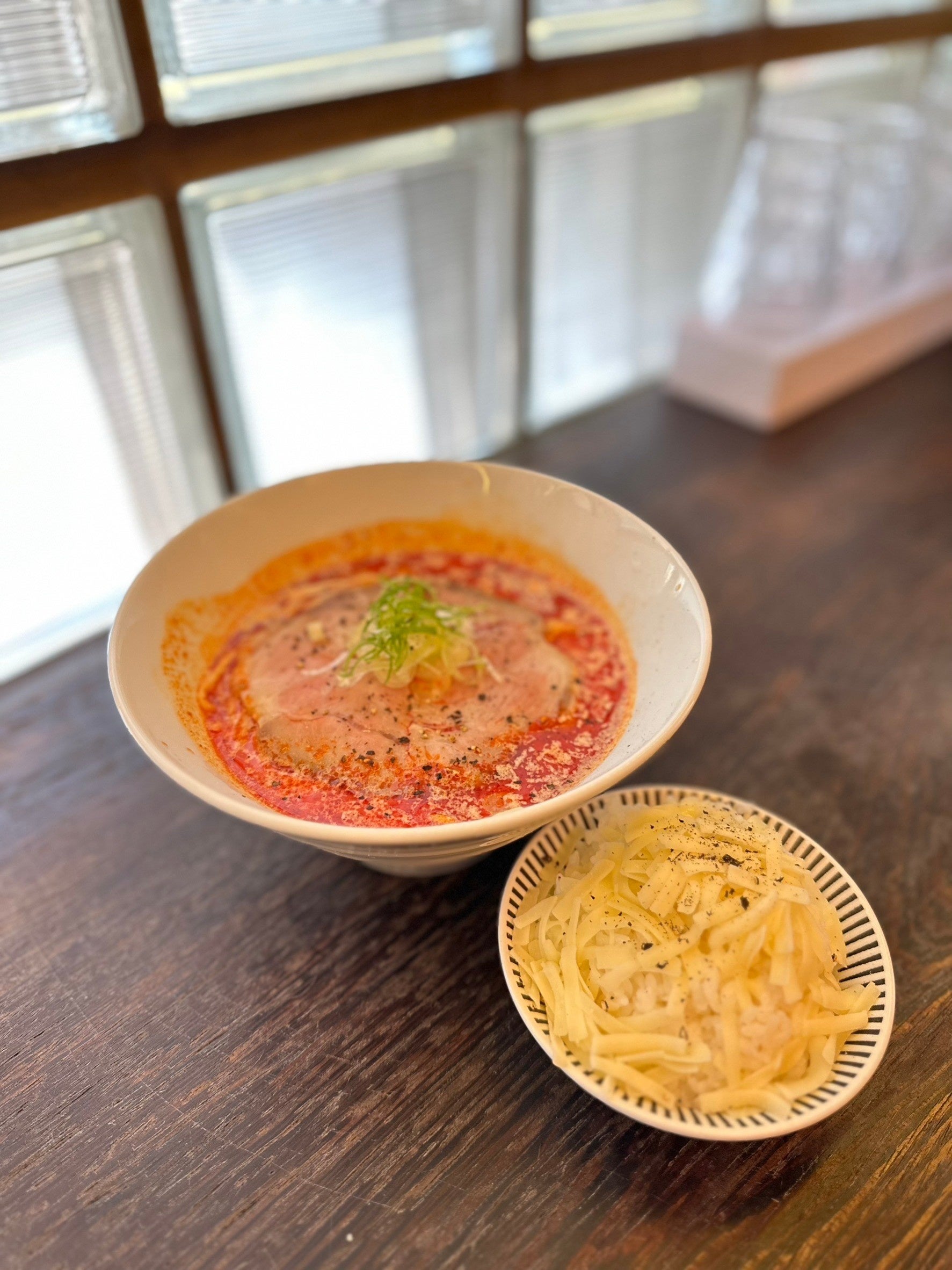 坦々麺の辛さを豆乳で調和させた絶妙な味は食べたことがあるようで他店では味わえない逸品。チーズリゾット付きを注文すると、濃厚な坦々スープにチーズのとろみが加わり、味わい深い別料理へと変化します。