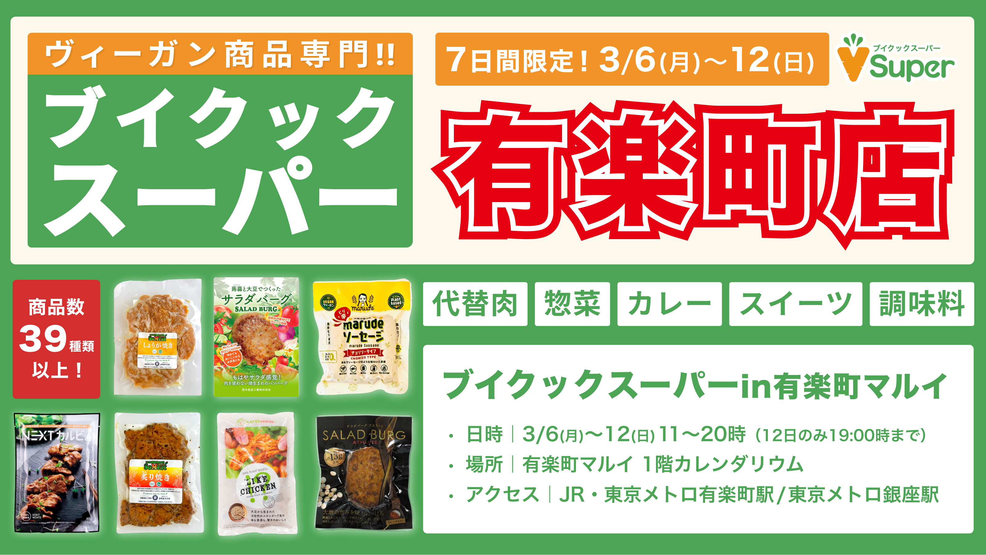 ブイクックスーパーin有楽町マルイは、肉・魚介類・卵・乳製品などの動物性材料を使用しない話題のヴィーガン食品を約40種類を取り扱う、3月6日(月)〜12日(日)の7日間限定のヴィーガンスーパーマーケットです。