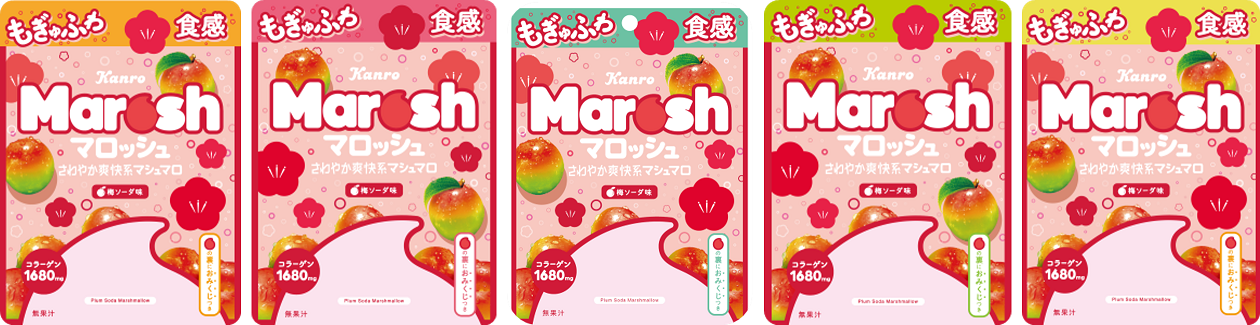 今回、新発売するのは梅の開花シーズンにもぴったりな「マロッシュ梅ソーダ味」です。駄菓子のような懐かしさのある爽やかな甘酸っぱさで、噛み応えのあるホイップ型の大粒サイズが特徴です。パッケージ上部は5色展開のデザインとなっており、梅の開花時期に合わせ華やかで可愛らしくポップな仕上がりに。また、マロッシュロゴの裏側には「おみくじ」がついており、全7種のポジティブな一言メッセージを楽しめます。